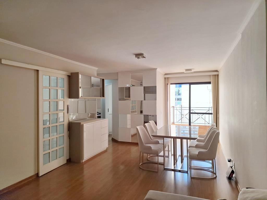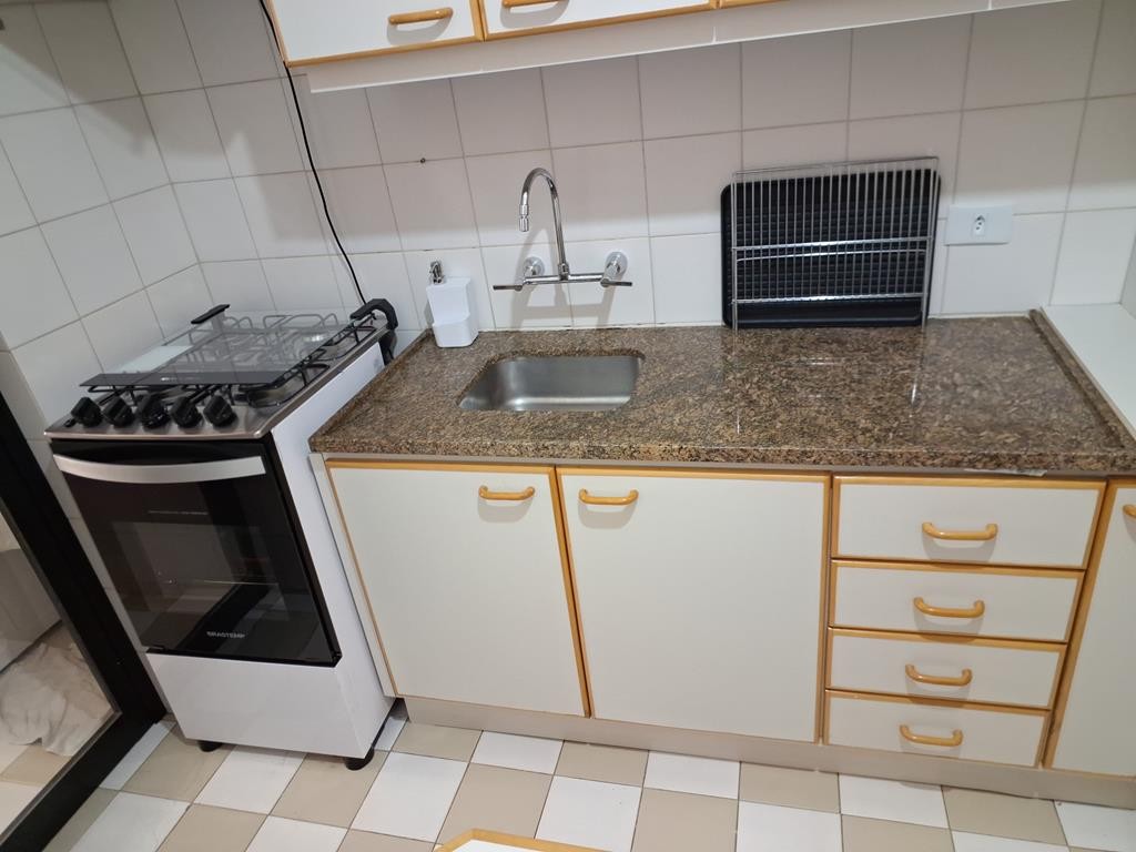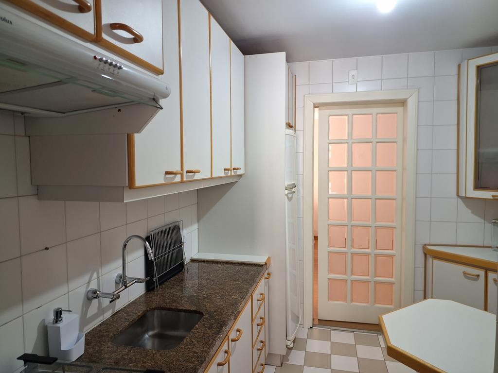 sala em dois ambientes com sacada e uma cozinha planejada com armários e tampo em granito.
