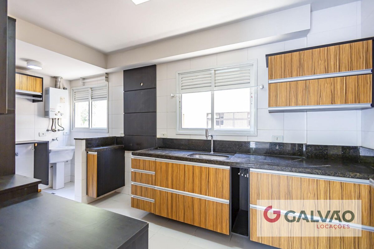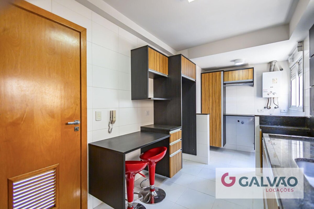 -Área de serviço interligada à cozinha, com tanque e armário.