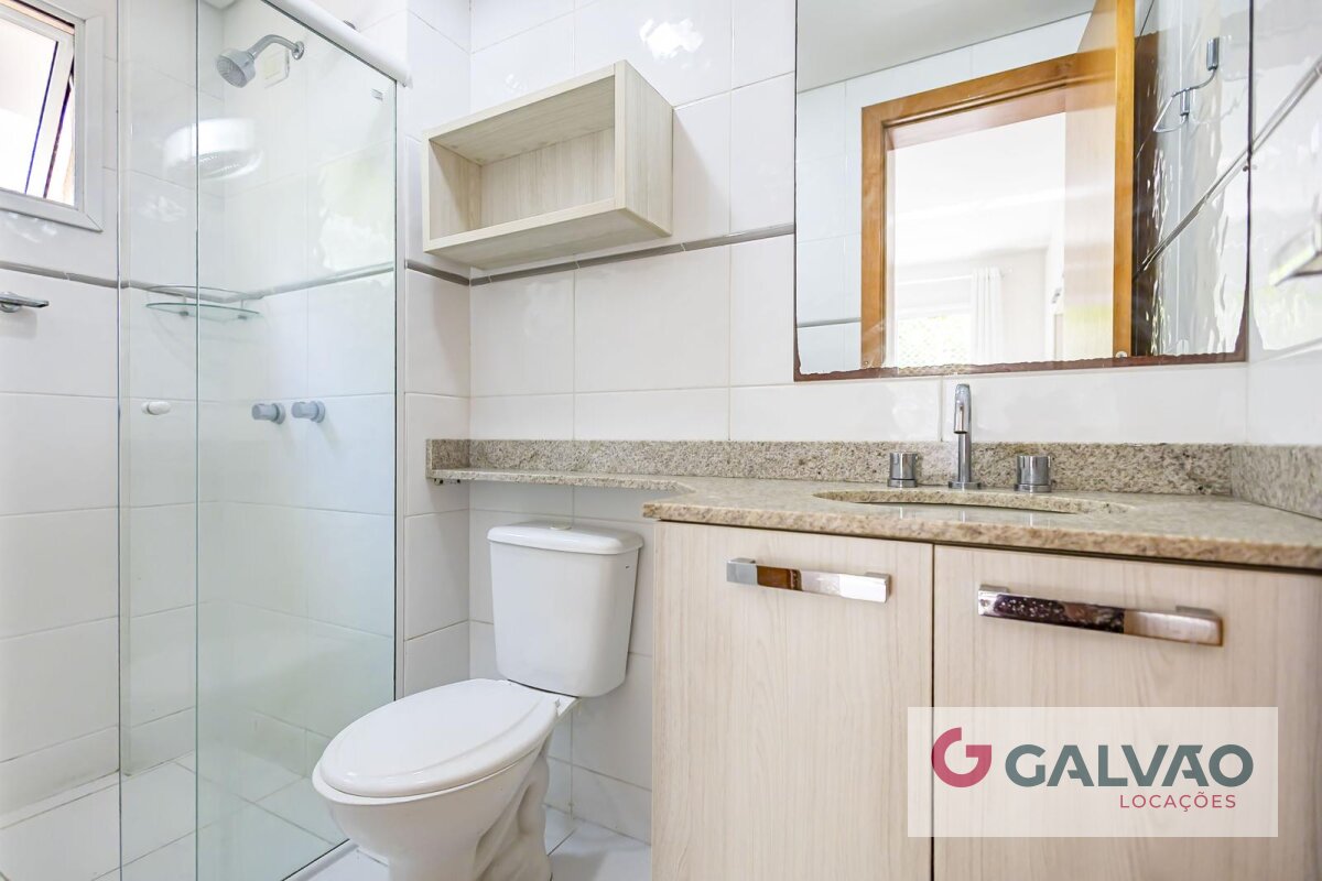 -Suíte e bwc social equipados com box em vidro, armário e espelho.