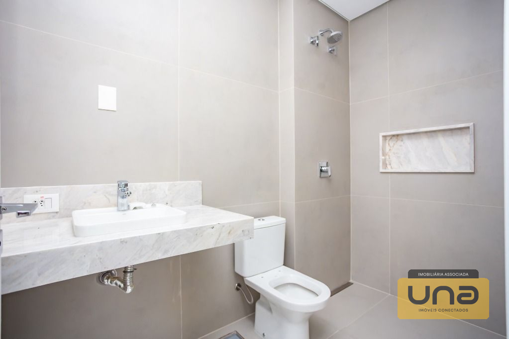 2 quartos com piso vinílico, sendo 1 suíte com piso aquecido e acabamentos em mármore branco Paraná