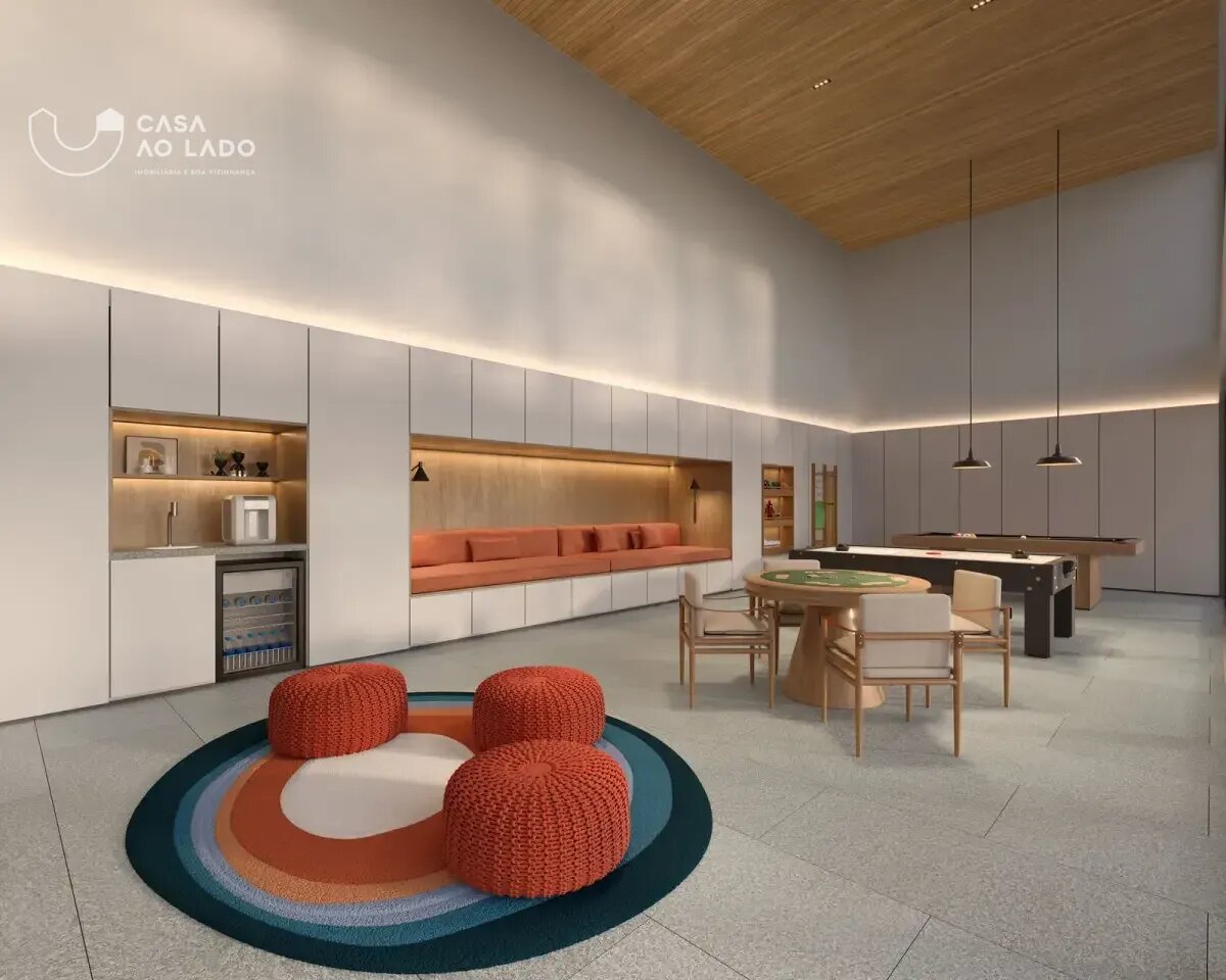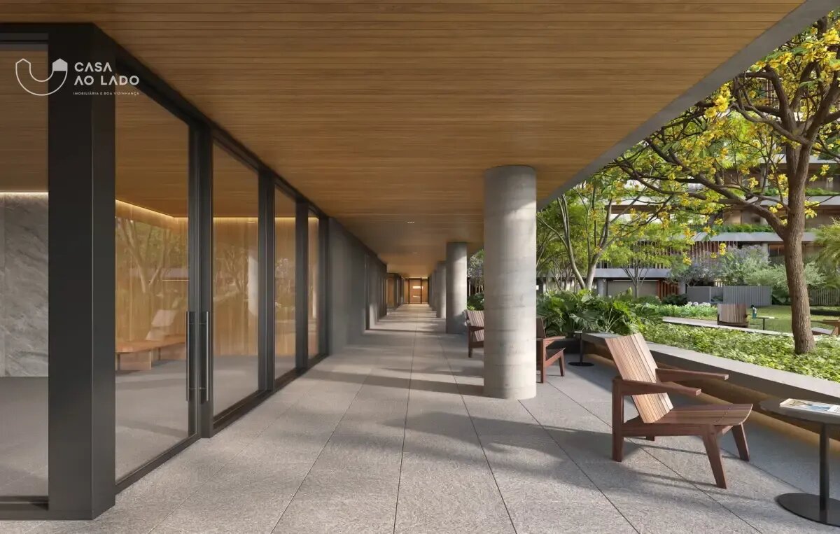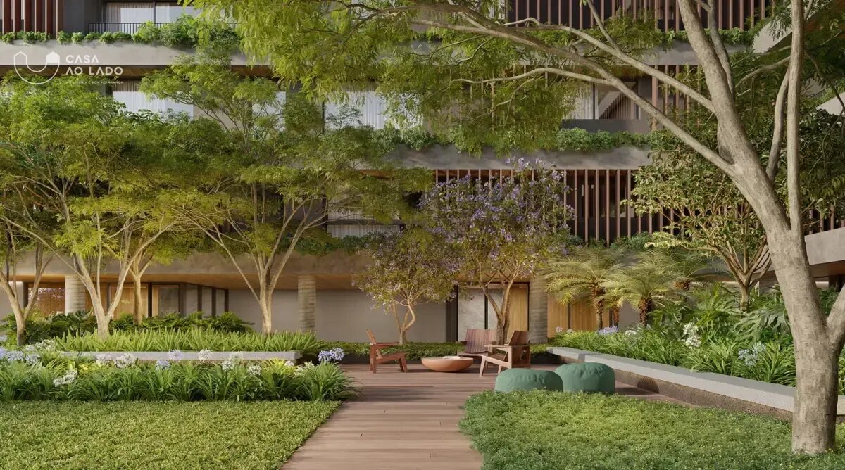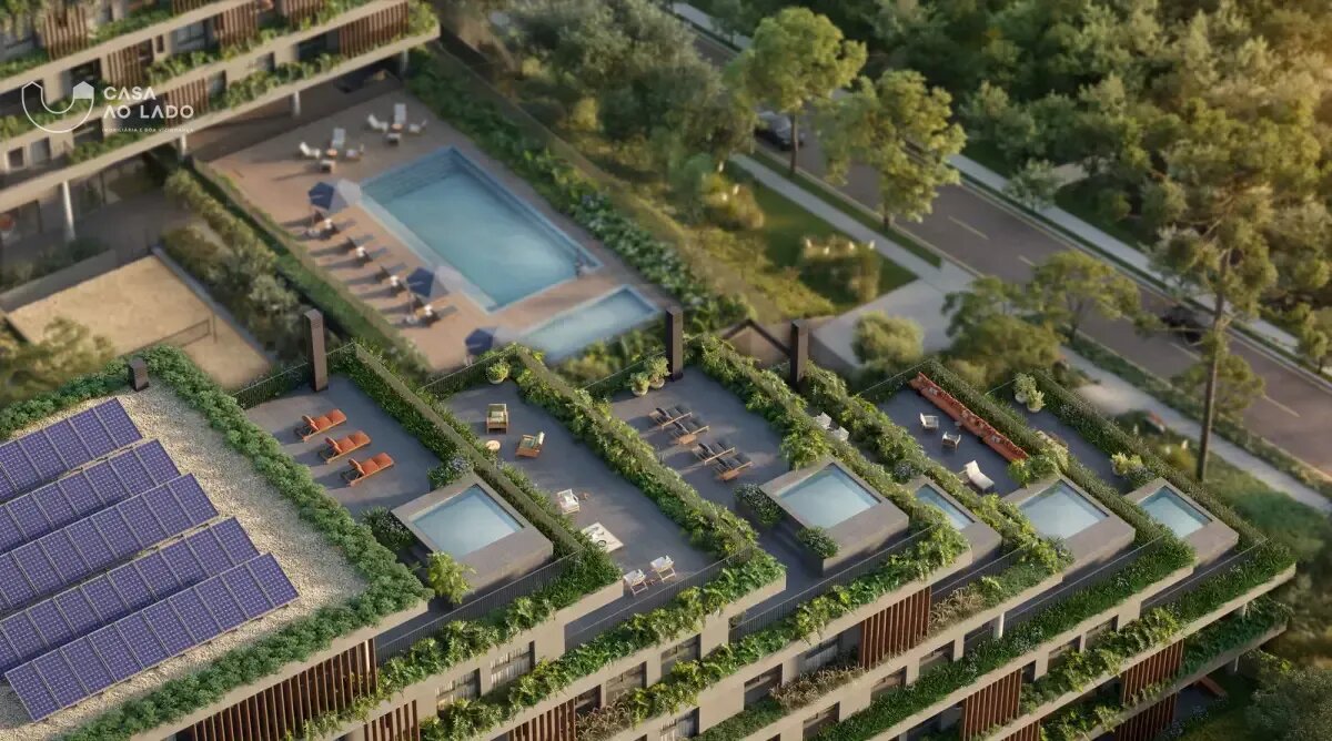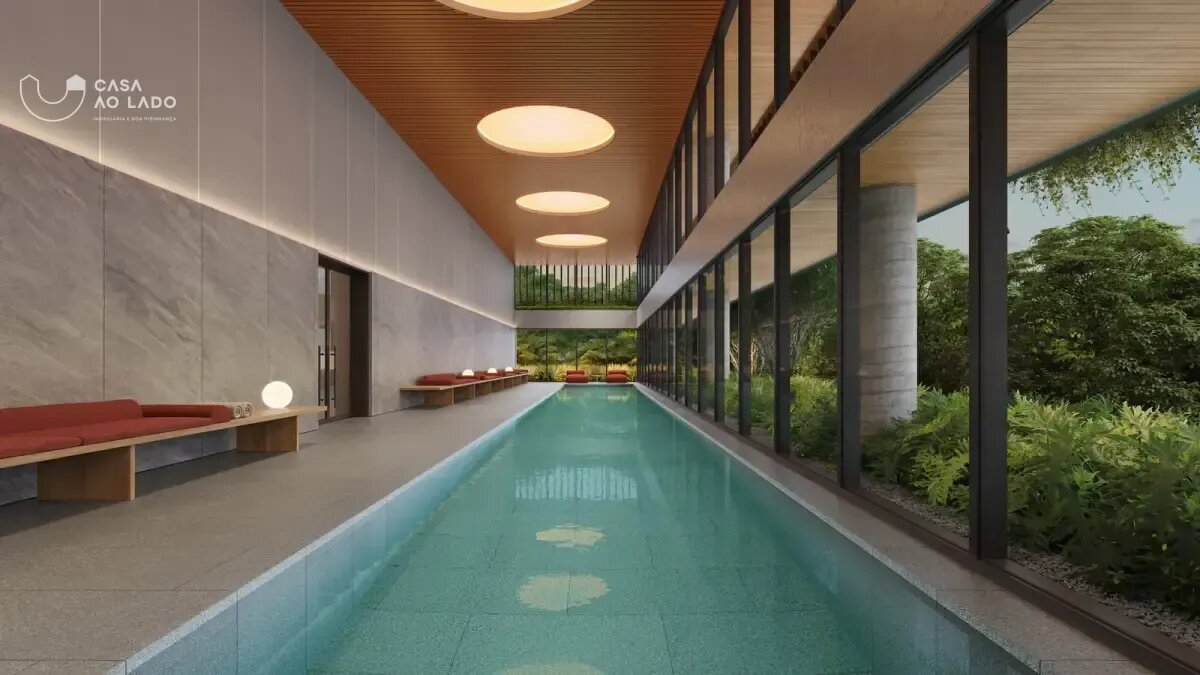 Condomínio Kaá | Comodidades: banheiro família, hall social, quadra de areia, quadra poliesportiva coberta, espaço diversão, brinquedoteca e espaço pet, piscinas coberta, descoberta, térmica, infantil e adulto, além de academia, espaço saúde e bem-estar, sauna e sala de jogos. Dispõe também de salão de festas, lounge, espaço gourmet, horta e bicicletário, escritórios, depósitos privativos, central de entregas e correspondências, vagas de visitantes (inclusive cobertas), além de vestiários e copa para funcionários, guarita blindada, eclusas social, de serviço e de veículos, além de acesso aos halls sociais com reconhecimento facial e elevadores sociais com biometria. O condomínio também oferece o aplicativo My Wellness para gestão de atividades.