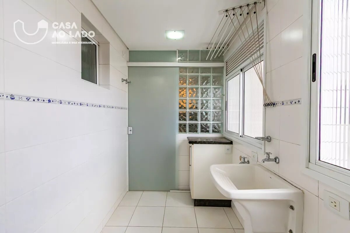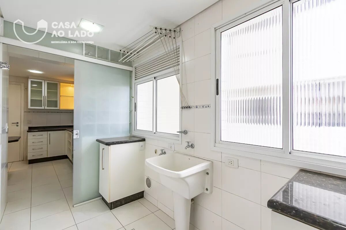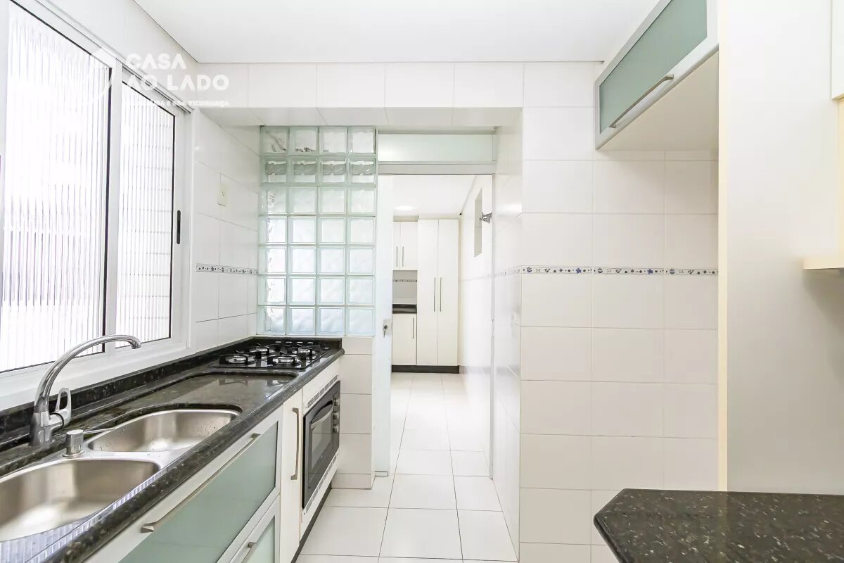 Apartamento recém pintado, com luminárias instaladas. A cozinha é mobiliada, conta com bancadas em pedra, forno e fogão, além de uma área de serviço separada, equipada com armários e bancada em pedra. Piso em cerâmica nessa área.A sala para dois ambientes — estar e jantar — é ampla e possui sacada.