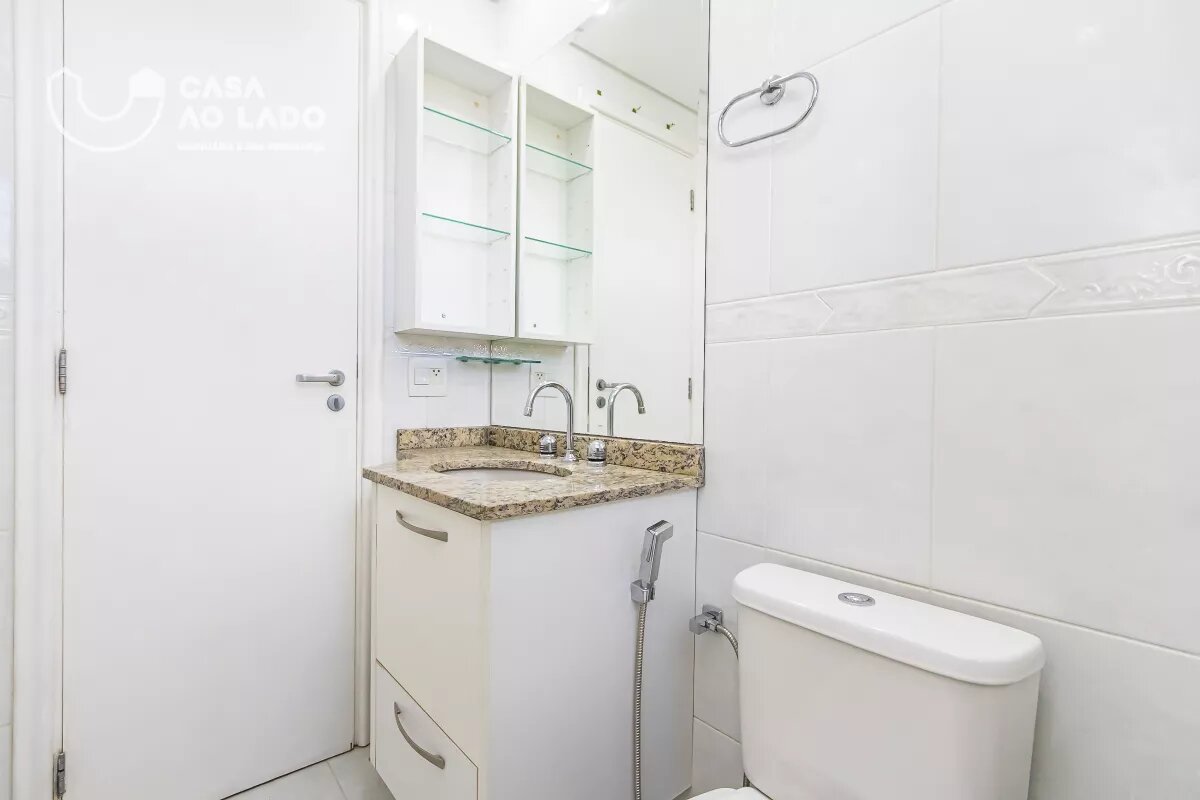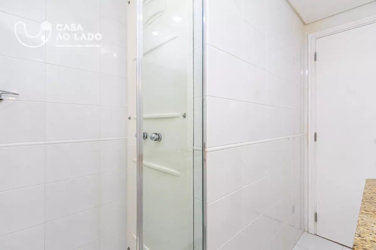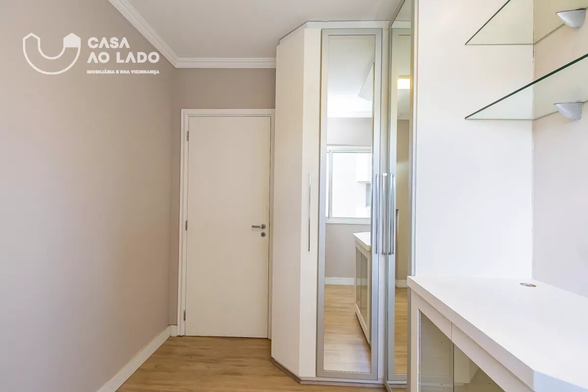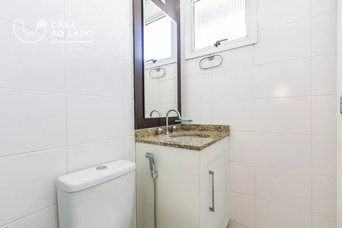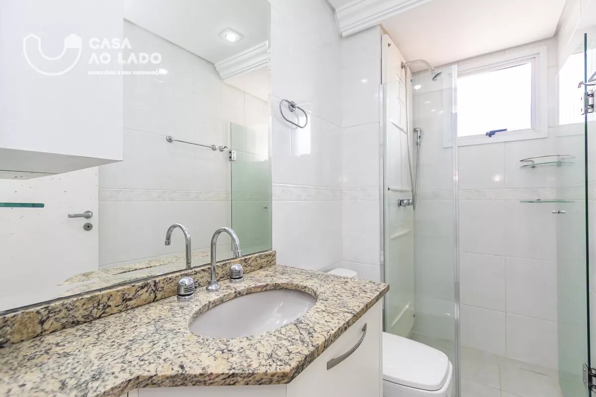 Na área íntima, há um banheiro social com armários, bancada em pedra e box. O 1º quarto possui armários embutidos, espelho e piso vinílico. O 2º quarto é uma suíte, com guarda-roupa, banheiro com box, acessórios em metal, espelho e divisórias com armários. O 3º quarto também conta com guarda-roupa, piso vinílico e banheiro privativo com armários, espelho, bancada em pedra, box e metais.