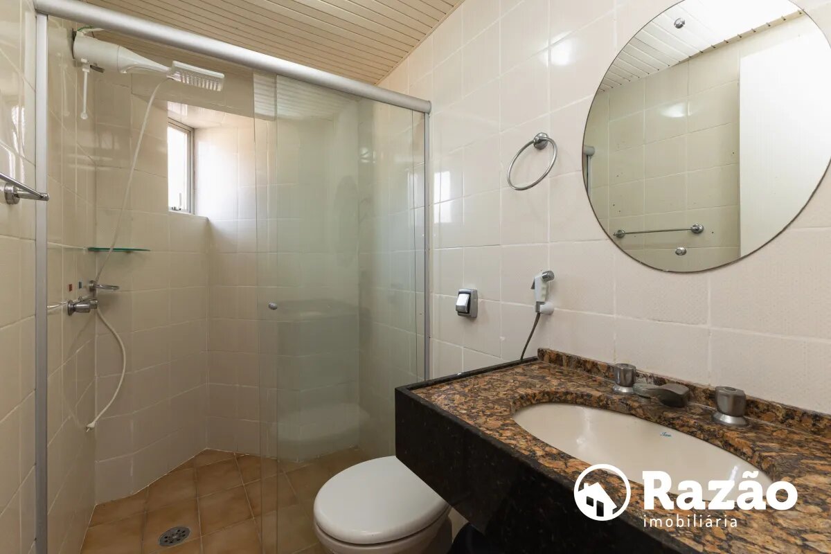 Banheiro social com espelho, box em vidro e sistema de aquecimento elétrico
