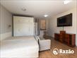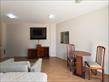 Sala completa equipada com rack, televisão, sofá, armário, mesa e cofre de segurança
