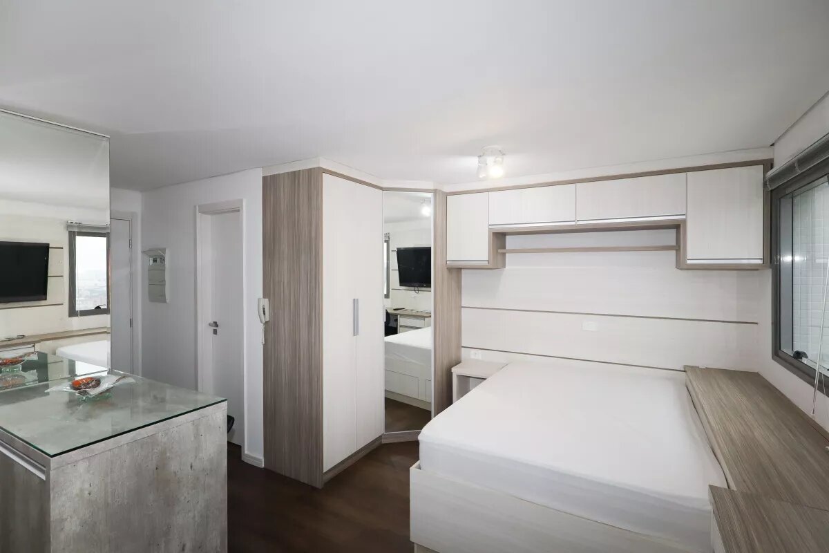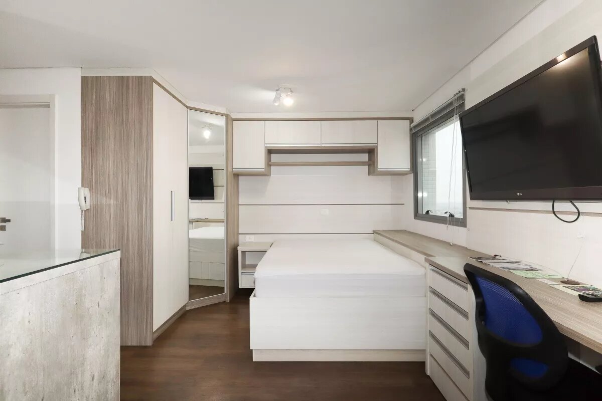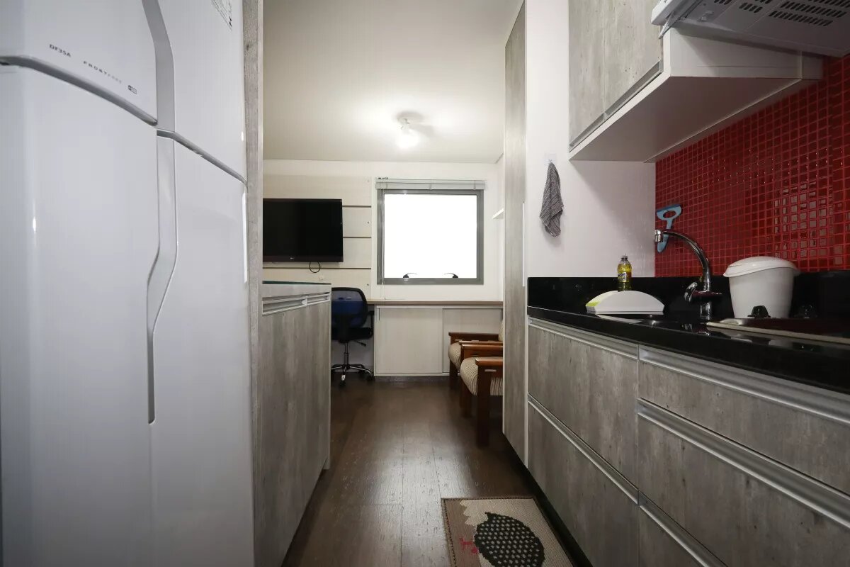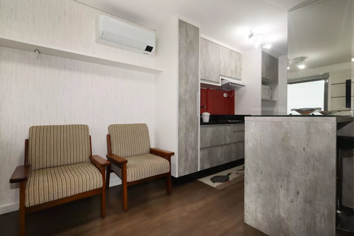 Studio com ar condicionado, decorado e mobiliado com bancada, cadeira giratória, duas poltronas, cozinha com armários, com geladeira, fogão, exaustor, cama de casal com colchão, armários, banheiro com chuveiro e box, uma vaga livre de garagem.