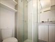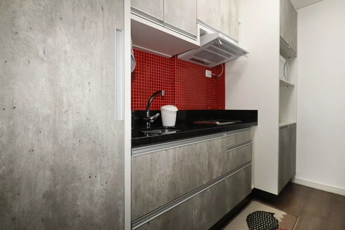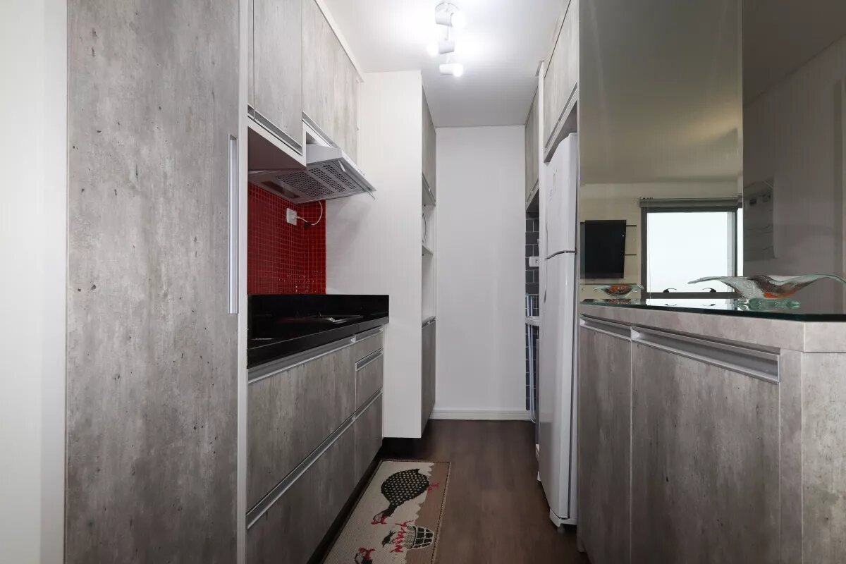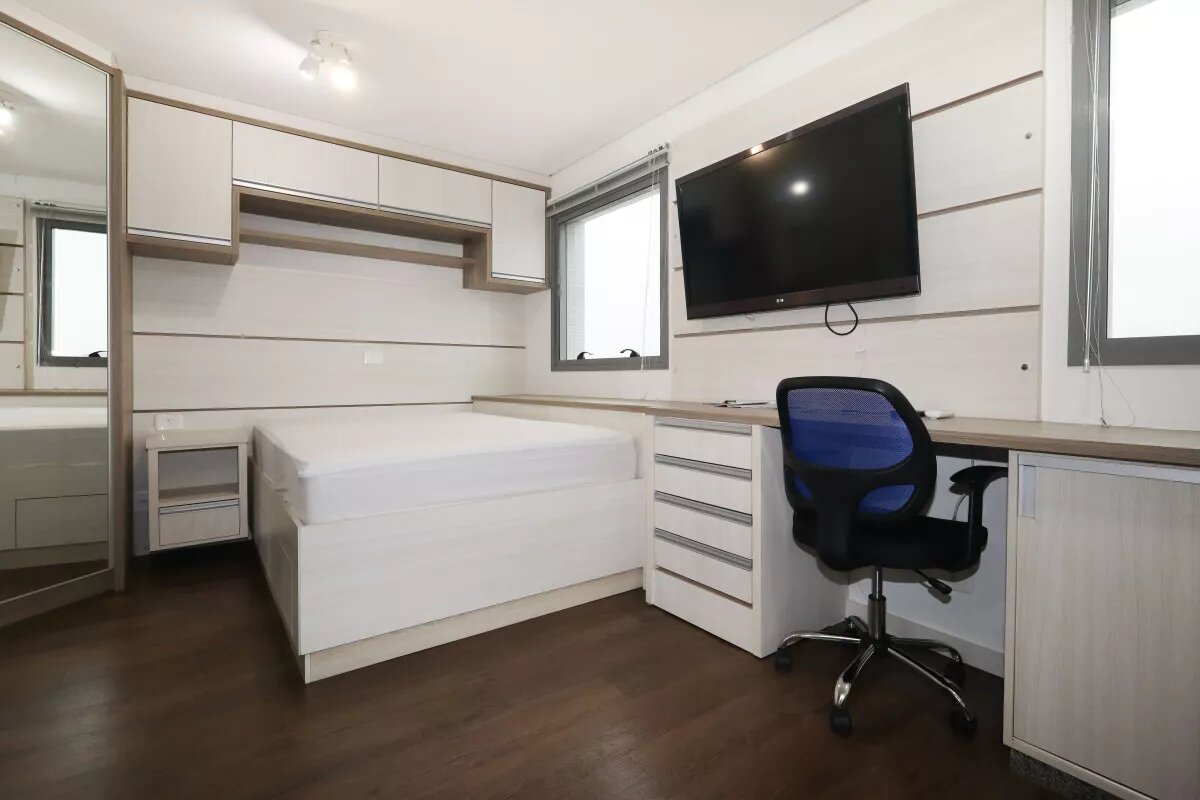 Studio com ar condicionado, decorado e mobiliado com bancada, cadeira giratória, duas poltronas, cozinha com armários, com geladeira, fogão, exaustor, cama de casal com colchão, armários, banheiro com chuveiro e box, uma vaga livre de garagem.