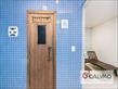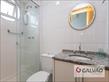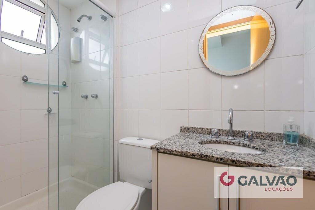 * Banheiro com box em vidro, armário e espelho.