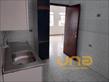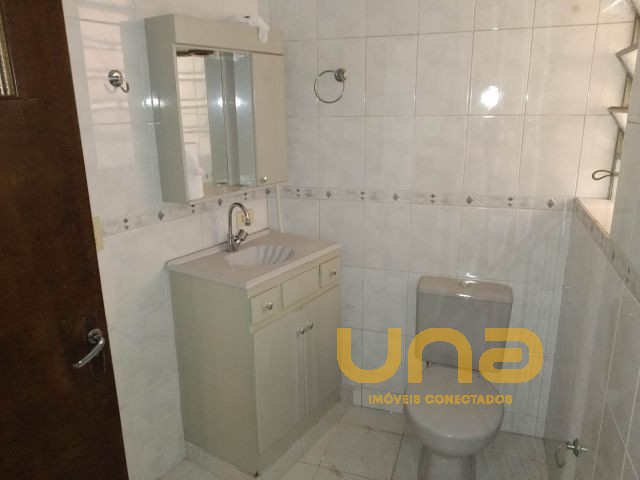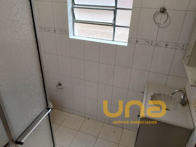 Cozinha com pia e armários, banheiro com box