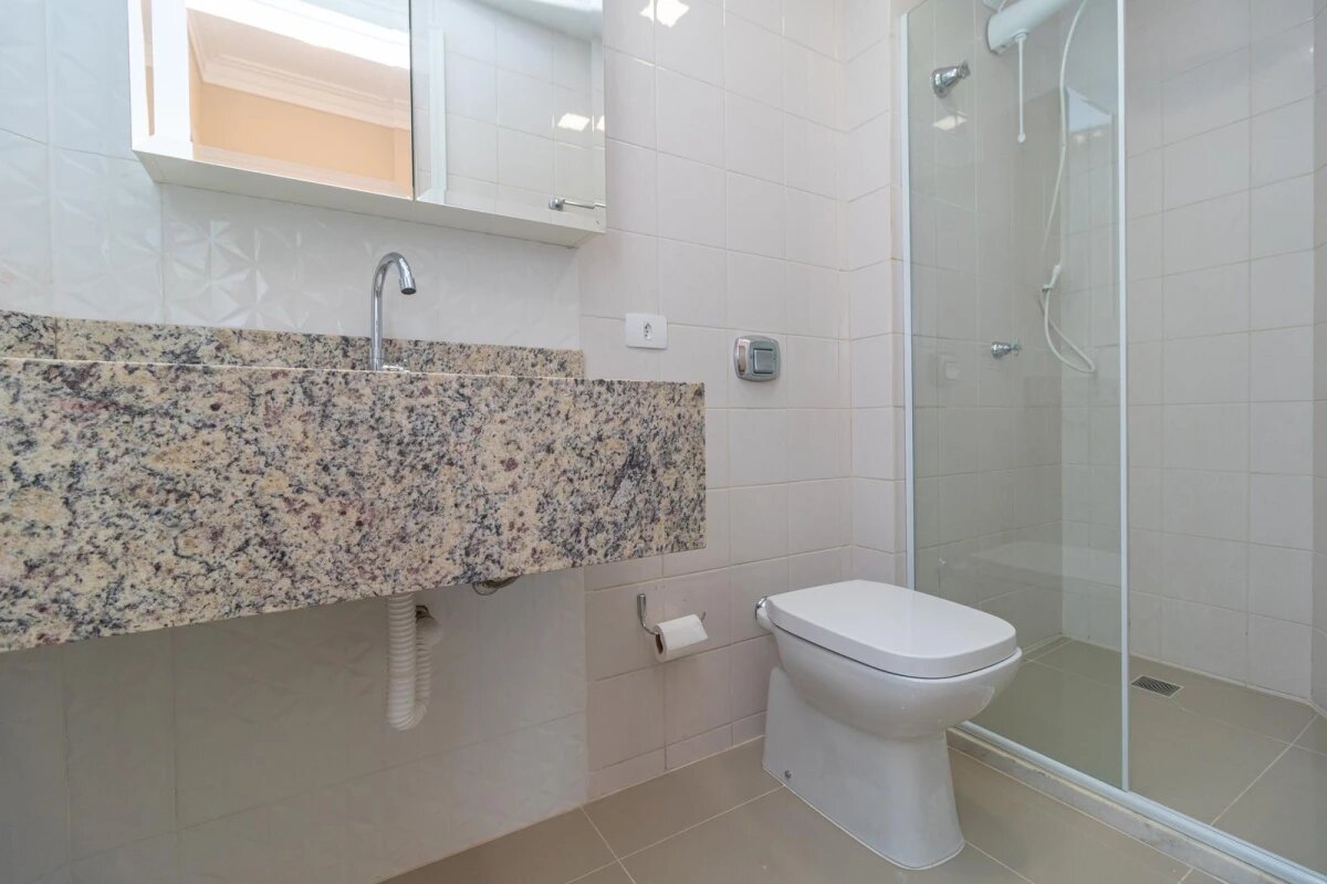 - Banheiro social com armário, espelho e box em blindex,