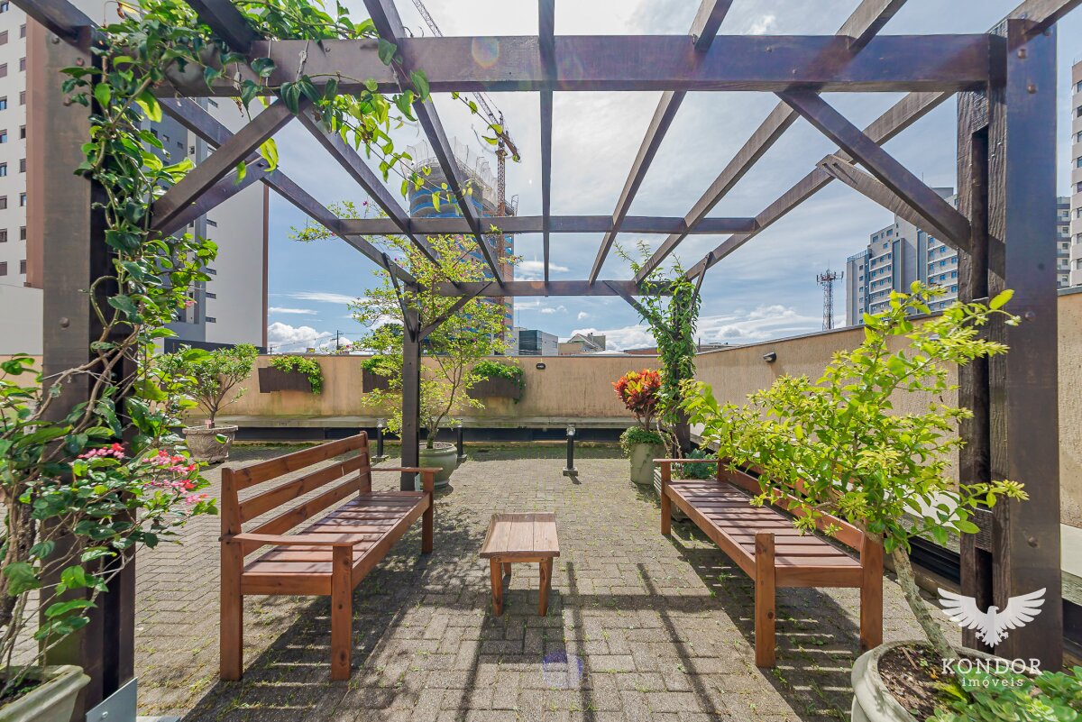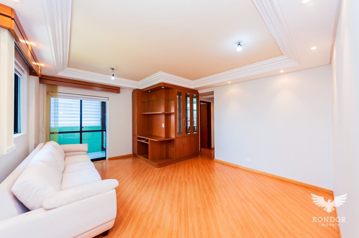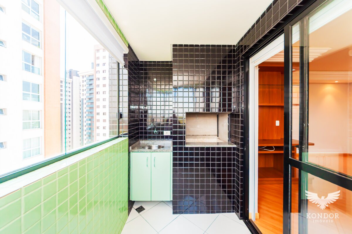 A sala conta com sofá e cristaleira, integrando-se à sacada com churrasqueira e vista privilegiada para o Jardim Botânico.
