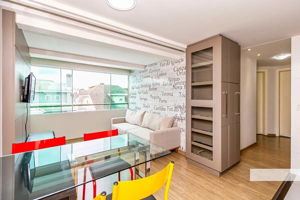 - Sala com rack, painel, sofá e mesa de jantar