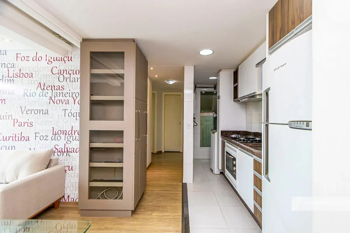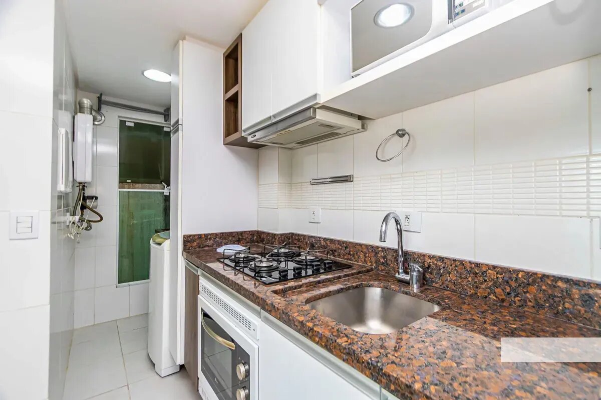 - Cozinha com armários, cooktop, forno, geladeira, micro-ondas