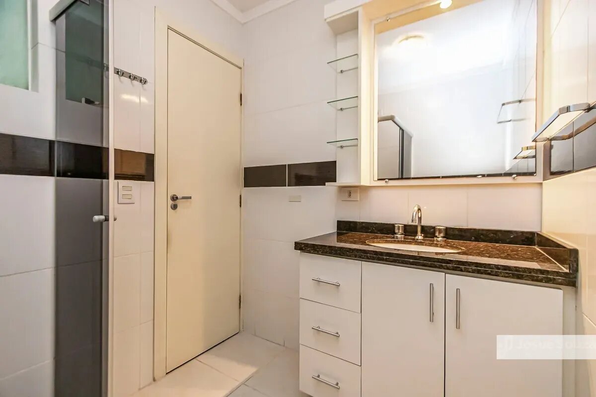 - Banheiro social com box, armário com cuba e espelho
