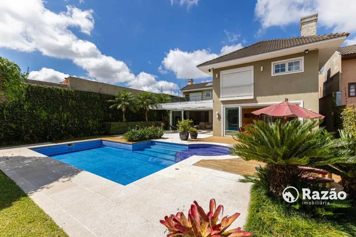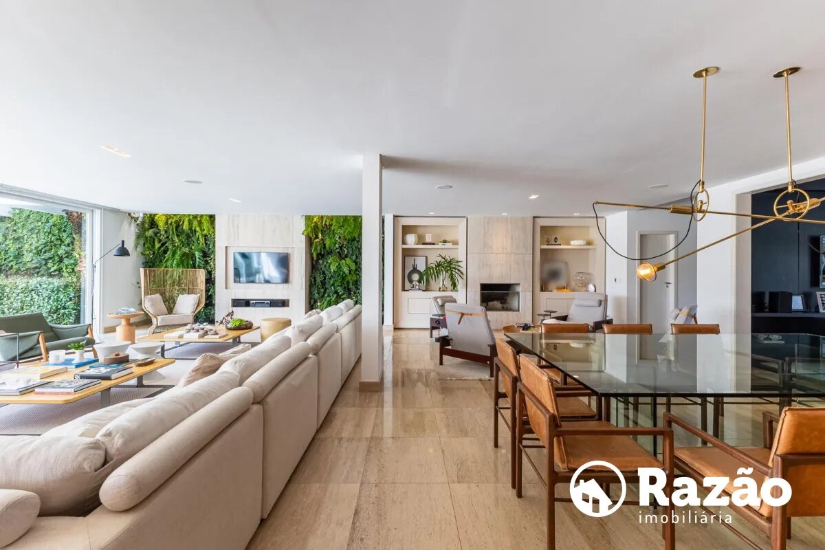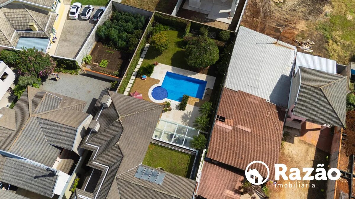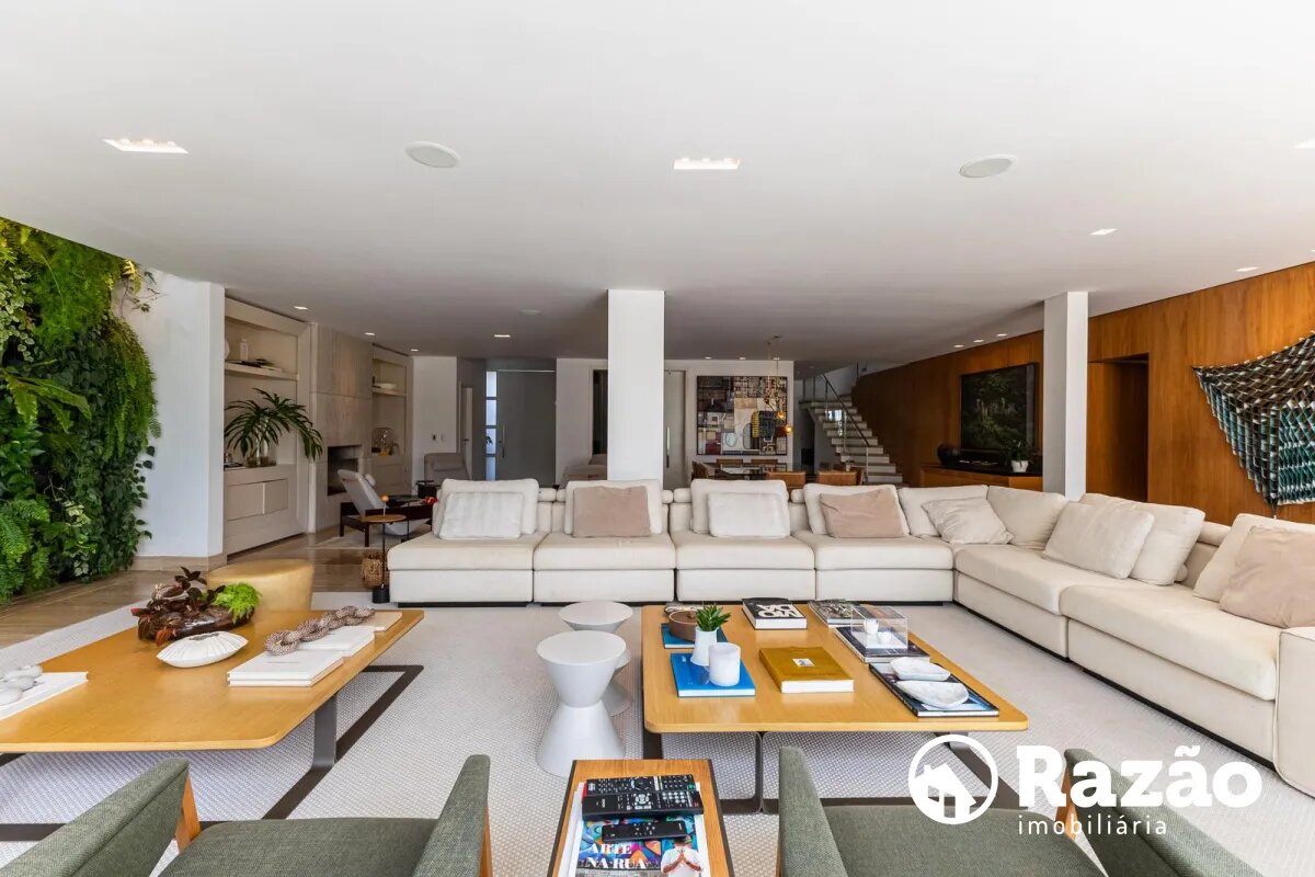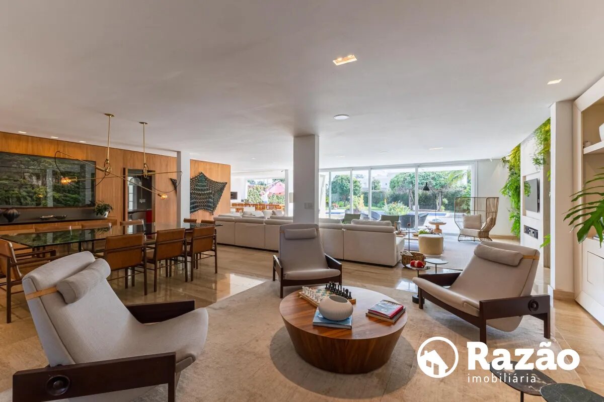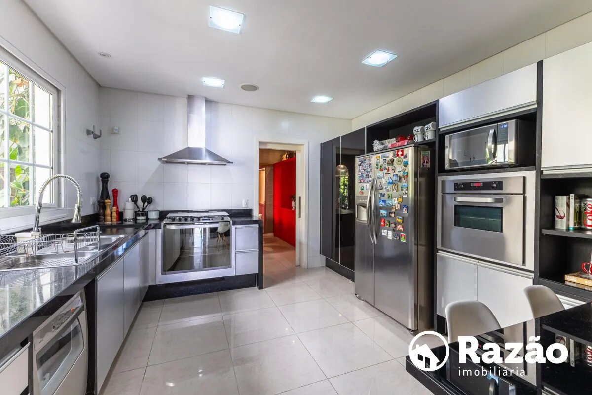 O imóvel conta com um amplo jardim e piscina infantil e adulto. São 5 salas integradas, incluindo 1 sala de estar, 1 sala de jantar, 1 sala de home theater individualizada e uma área gourmet com churrasqueira, forno de pizza, forno de indução e fogão a lenha. Ainda no pavimento térreo há 1 ampla suíte, 2 lavabos (um para visitantes e outro para a área da piscina e gourmet), e uma cozinha espaçosa com despensa. A área de serviço e dependência completa de empregada possuem entrada independente junto à garagem.