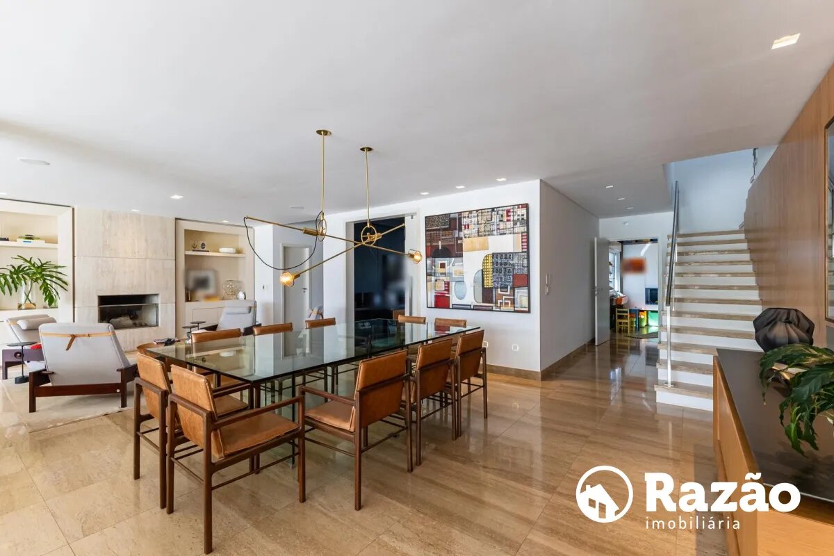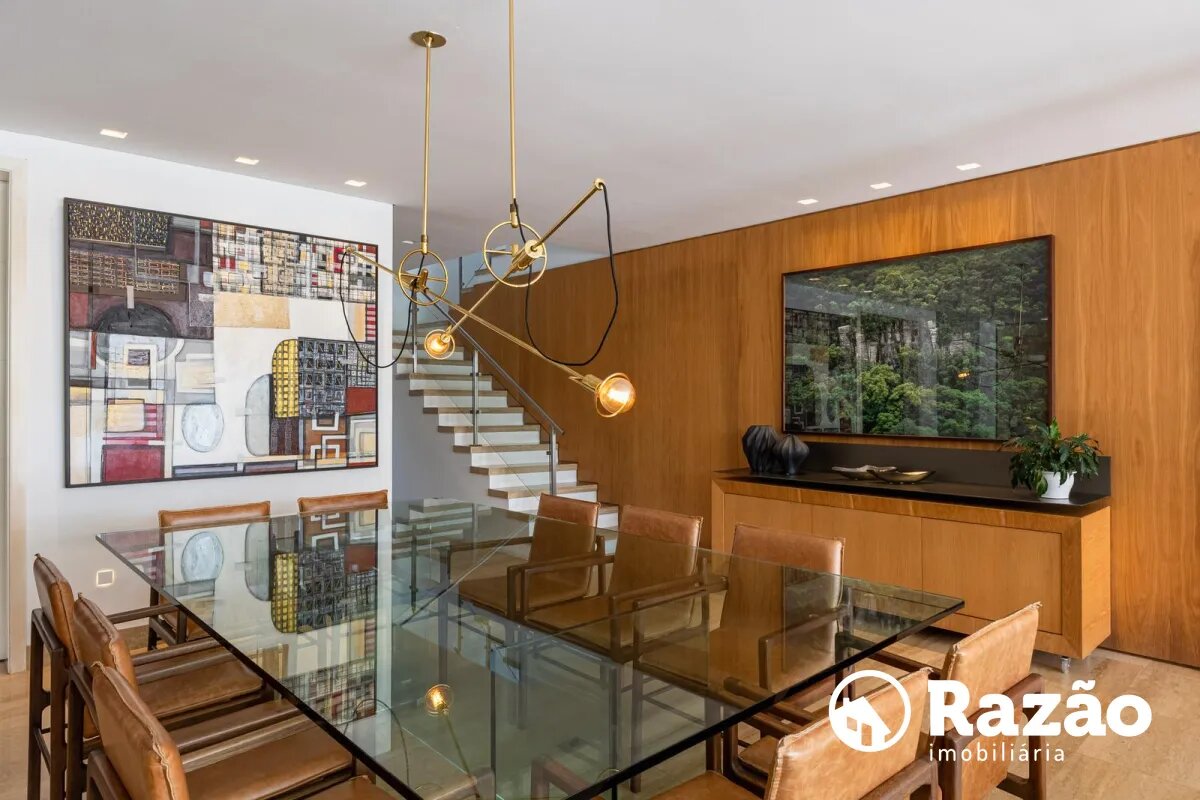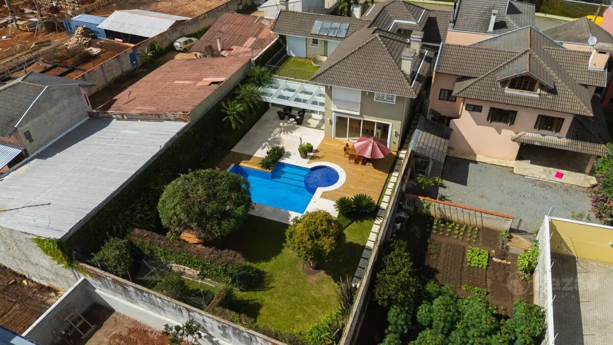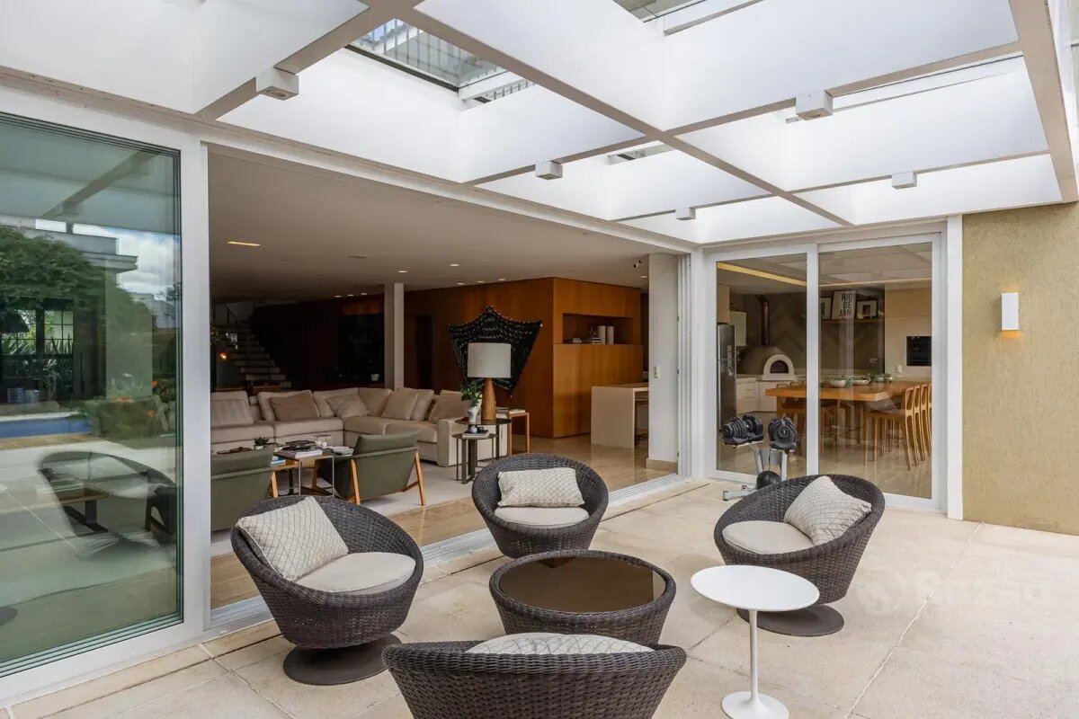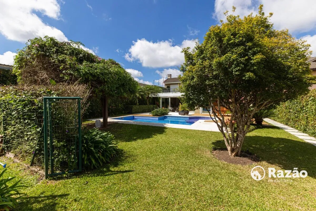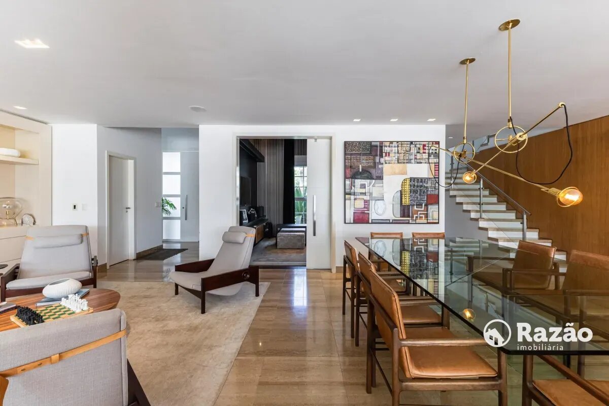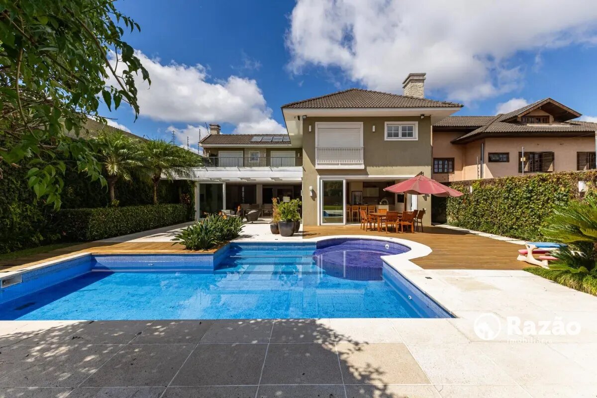O imóvel conta com um amplo jardim e piscina infantil e adulto. São 5 salas integradas, incluindo 1 sala de estar, 1 sala de jantar, 1 sala de home theater individualizada e uma área gourmet com churrasqueira, forno de pizza, forno de indução e fogão a lenha. Ainda no pavimento térreo há 1 ampla suíte, 2 lavabos (um para visitantes e outro para a área da piscina e gourmet), e uma cozinha espaçosa com despensa. A área de serviço e dependência completa de empregada possuem entrada independente junto à garagem.