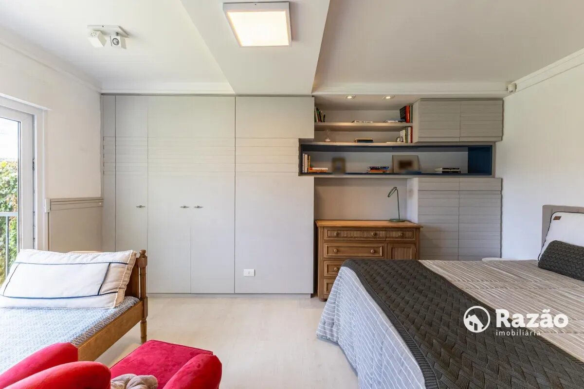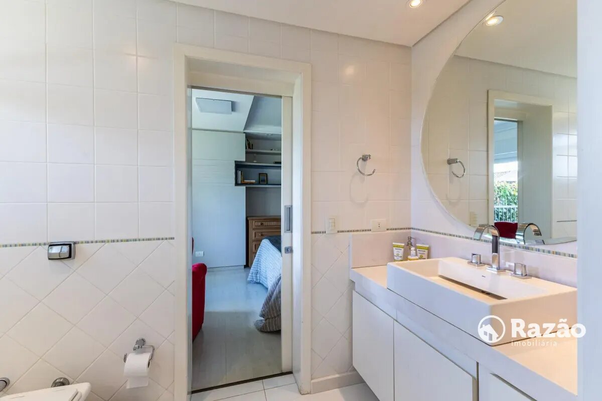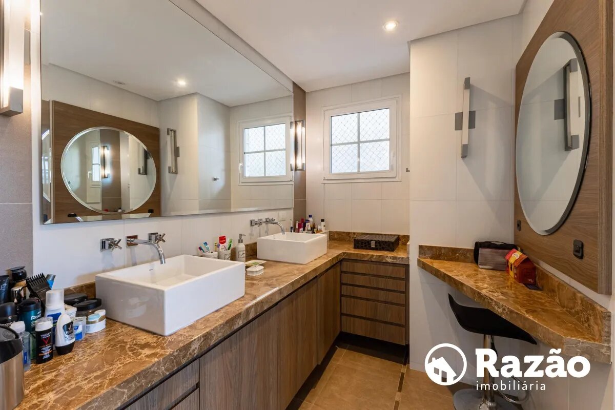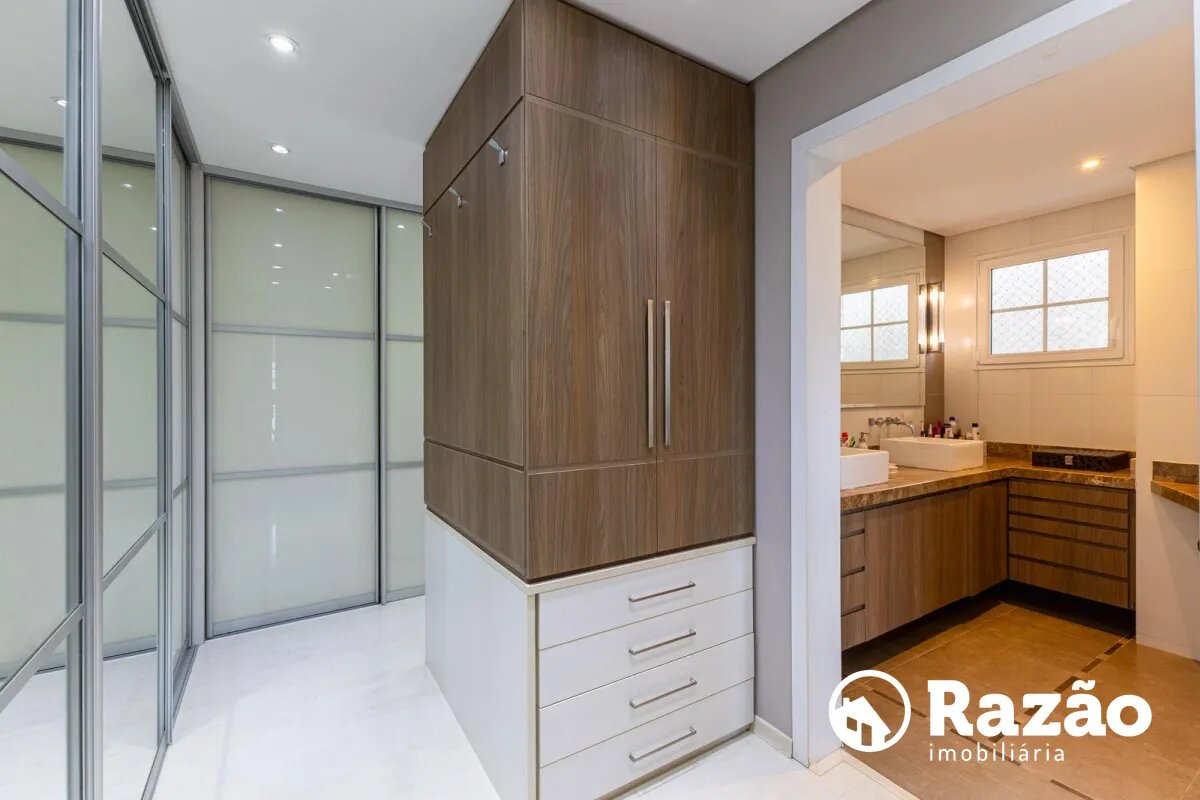 No pavimento superior, a casa dispõe de 3 quartos, sendo 1 suíte master com closet, banheiro individualizado com espaço para maquiagem e banheira, além de sacada. Há também 2 demi-suítes com banheiro de uso comum e um dos quartos com sacada. A circulação conta com um amplo roupeiro.