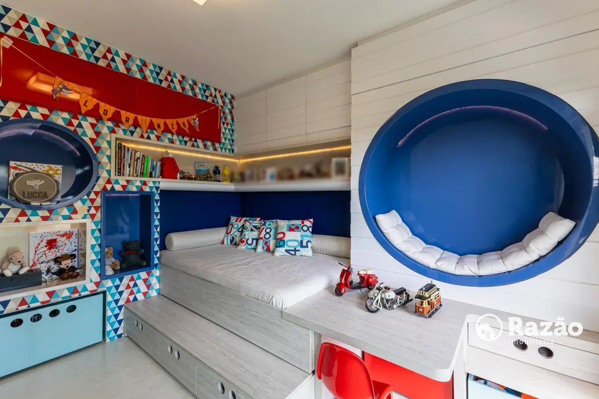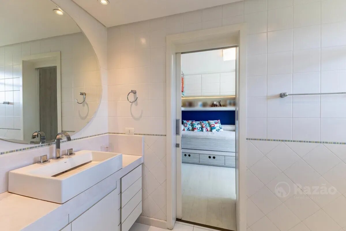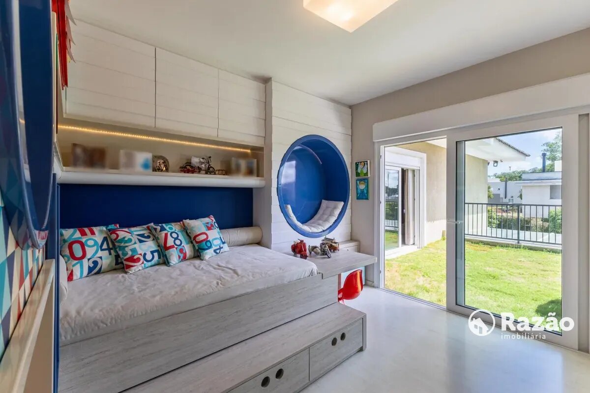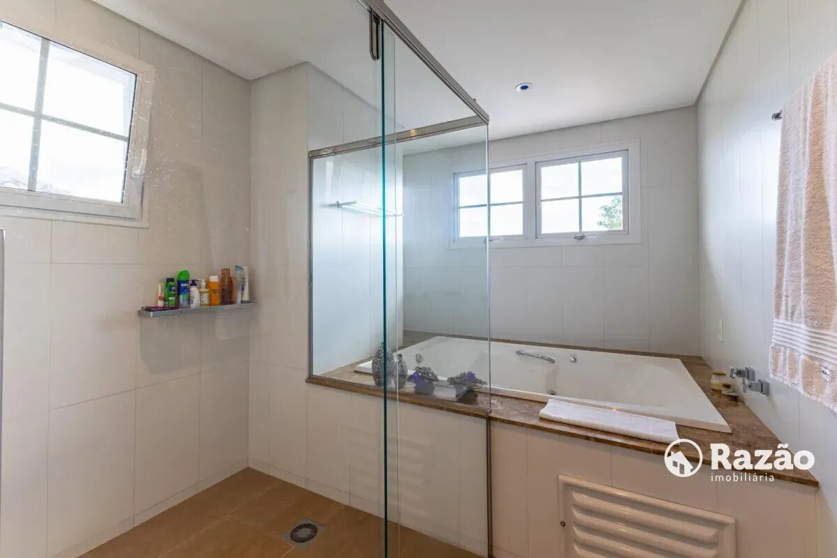 No pavimento superior, a casa dispõe de 3 quartos, sendo 1 suíte master com closet, banheiro individualizado com espaço para maquiagem e banheira, além de sacada. Há também 2 demi-suítes com banheiro de uso comum e um dos quartos com sacada. A circulação conta com um amplo roupeiro.