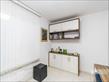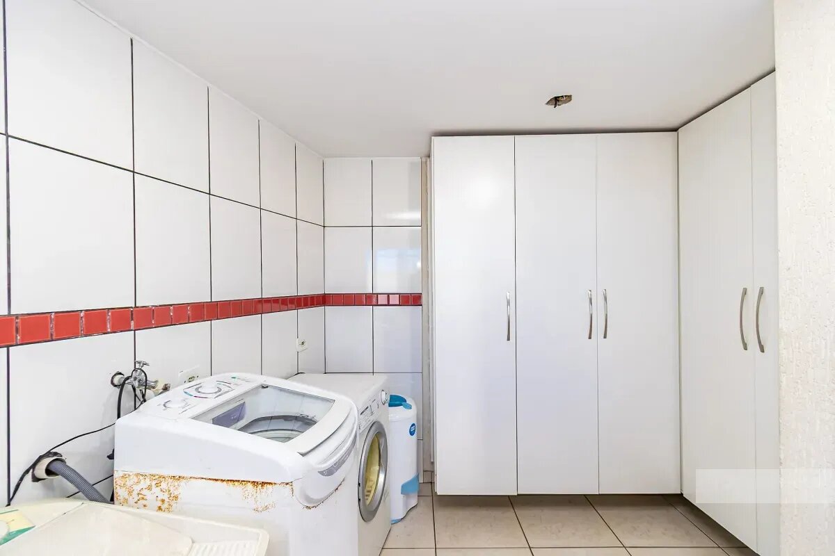 Lavanderia com armários e terraço no piso superior do espaço gourmet.