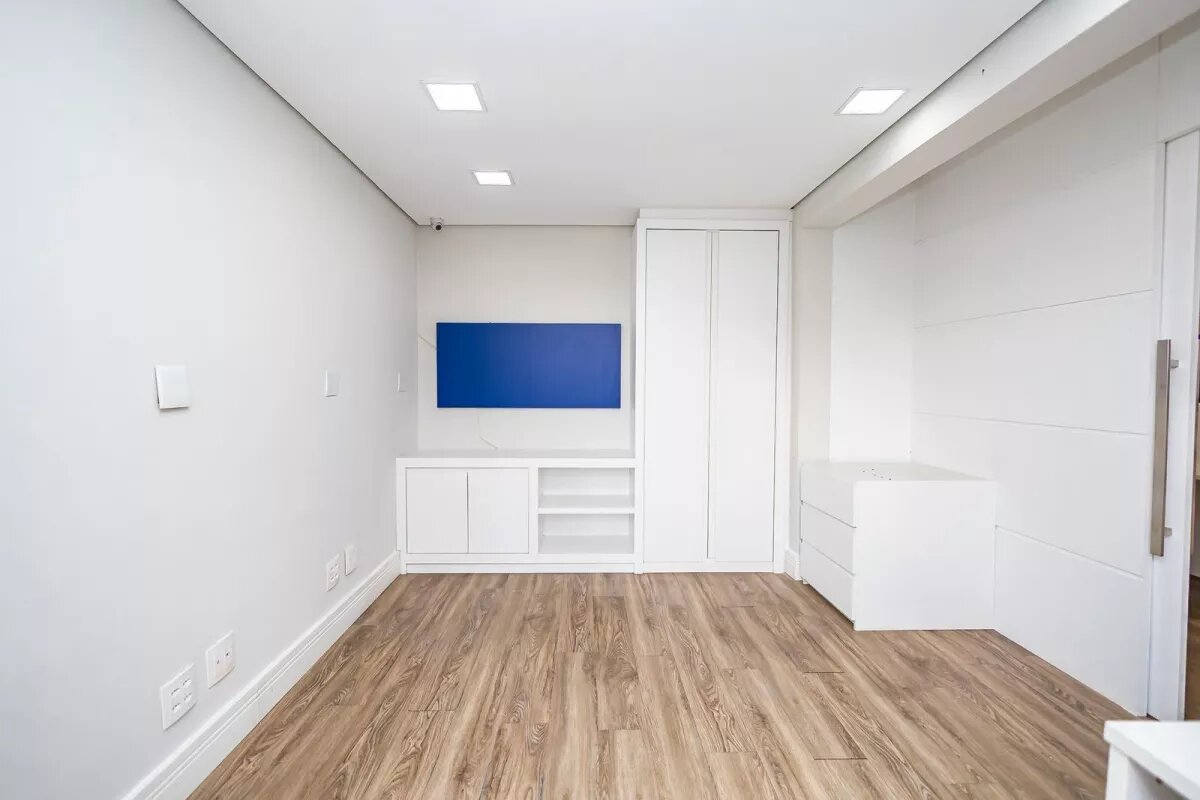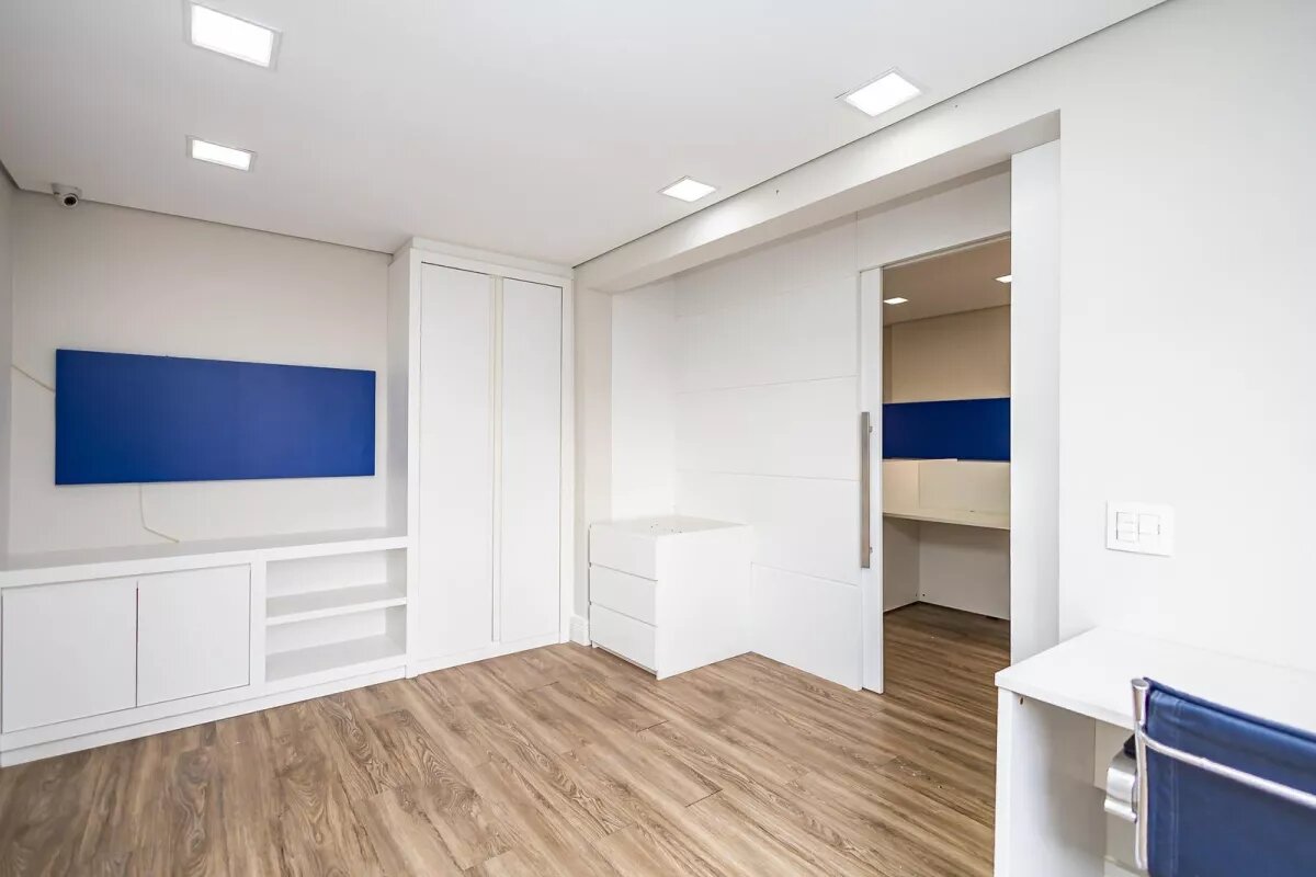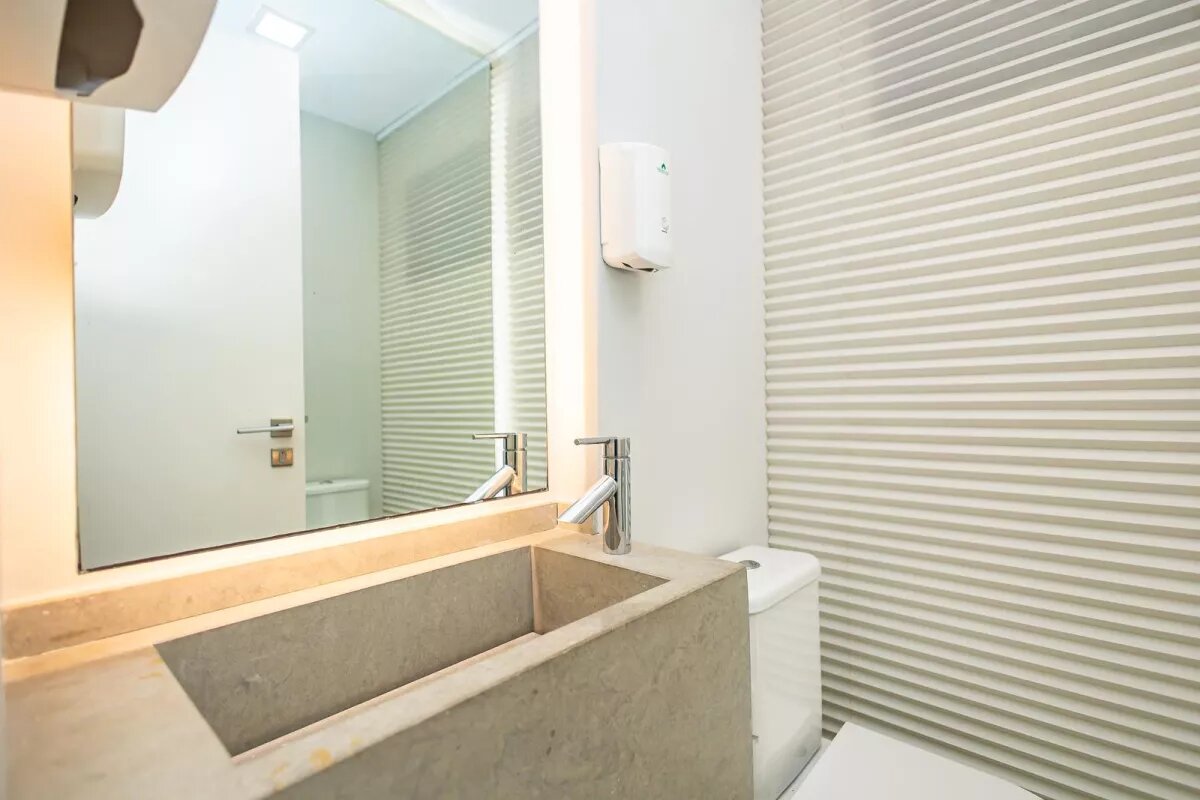 Persianas motorizadas nas salas principal e de reunião, proporcionando conforto e controle de luminosidade.