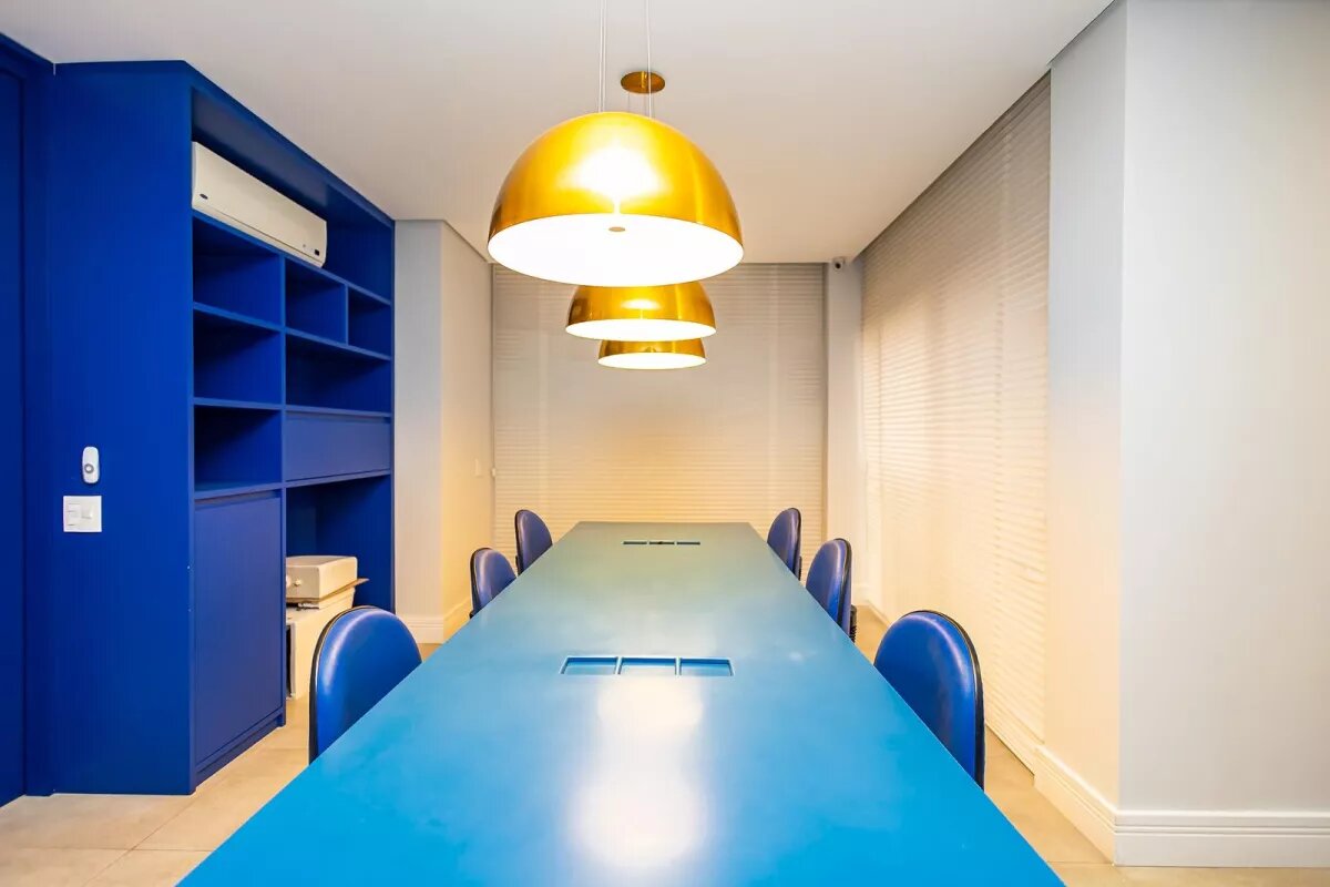 Sala de reunião equipada para apresentações, conferências e videochamadas.
