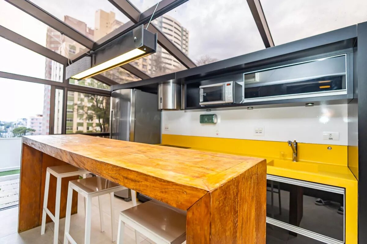 Espaço gourmet exclusivo, integrado à sala principal e ao terraço, equipado com geladeira, fogão, forno elétrico, coifa e micro-ondas — perfeito para momentos de integração e descontração da equipe.