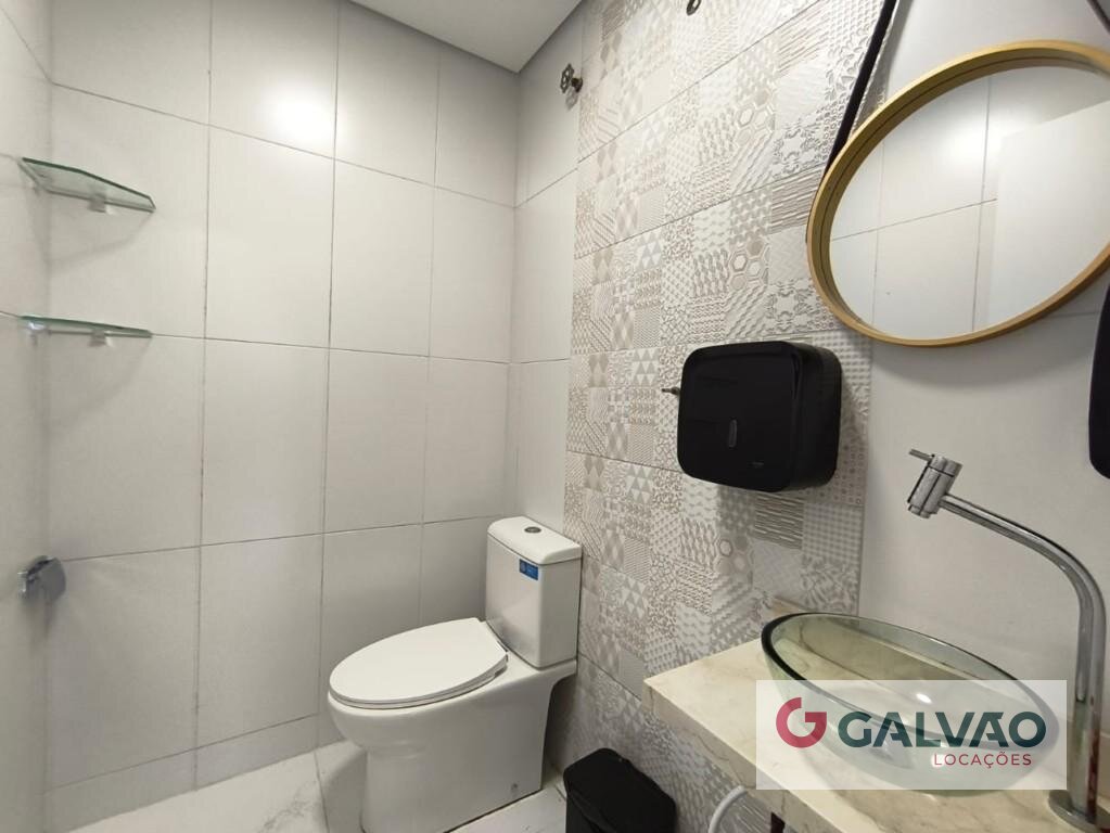 * Banheiro revestido em azulejo e espelho,