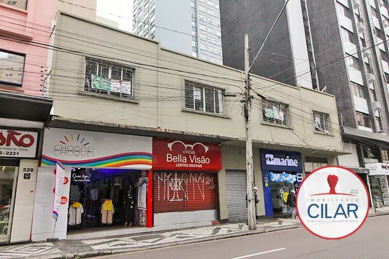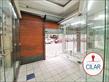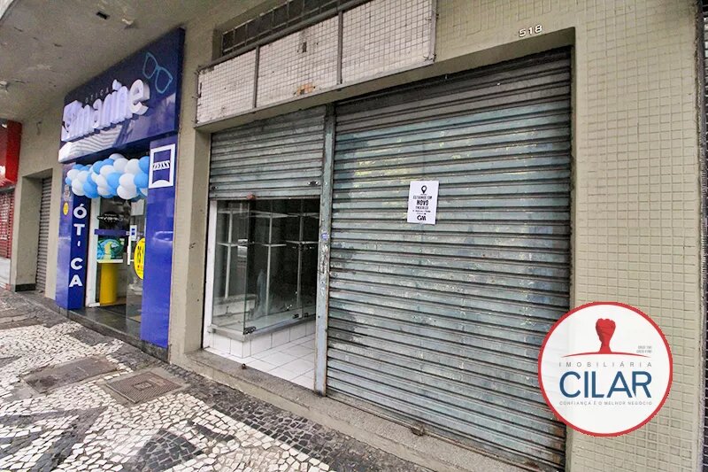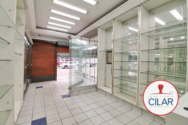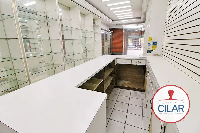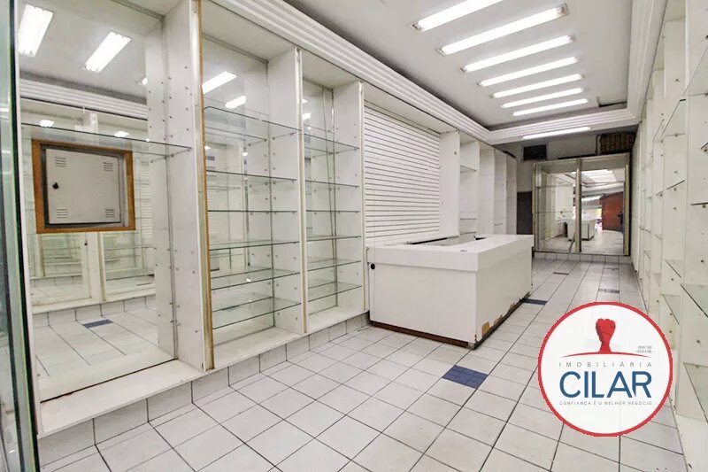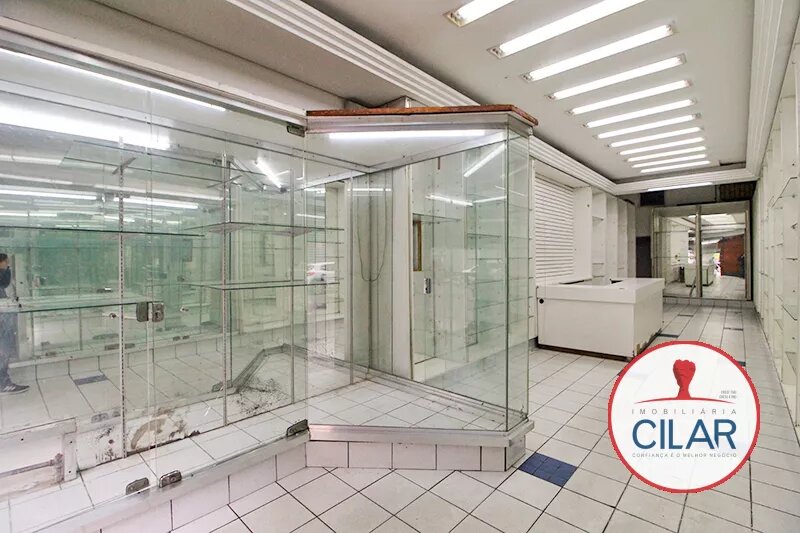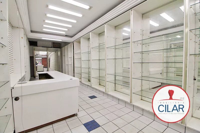 Sala ampla com expositores envidraçados, vitrines, luminárias grandes, sancas em gesso, balcão com armário, banheiro, copa, piso em cerâmica, porta dupla de aço.