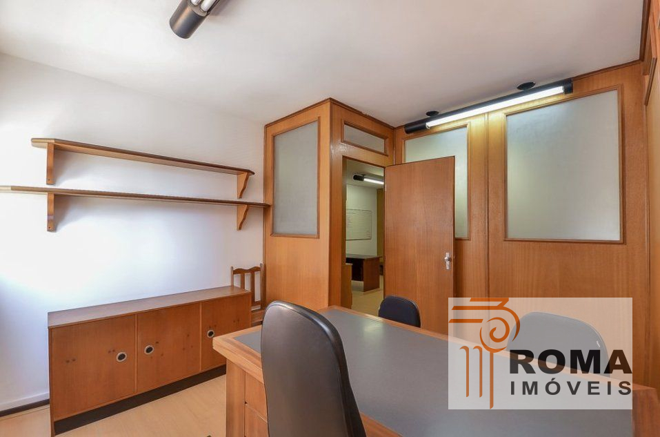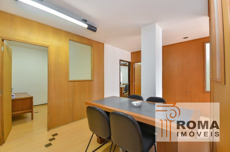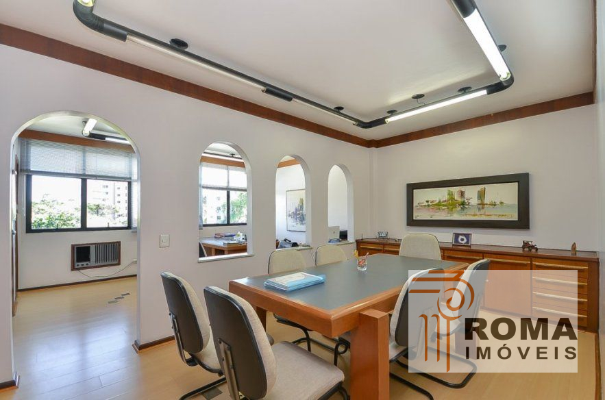Com 233,14 m² de área, recepção, duas salas privativas com banheiros três salas com divisórias em mogno, mobiliado com armários e estantes, banheiros e cozinha.