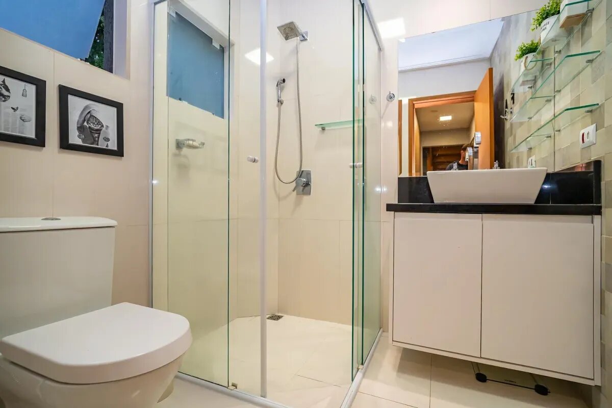 No terceiro piso (ático), 1 ampla suíte. Além de ambiente para uma sala íntima / espaço para jogos, lavabo e escritório.