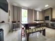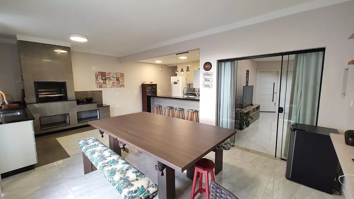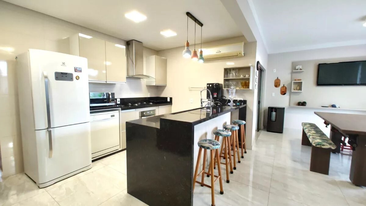 A sala de jantar, cozinha e área de churrasqueira são integradas e faz conexão com área