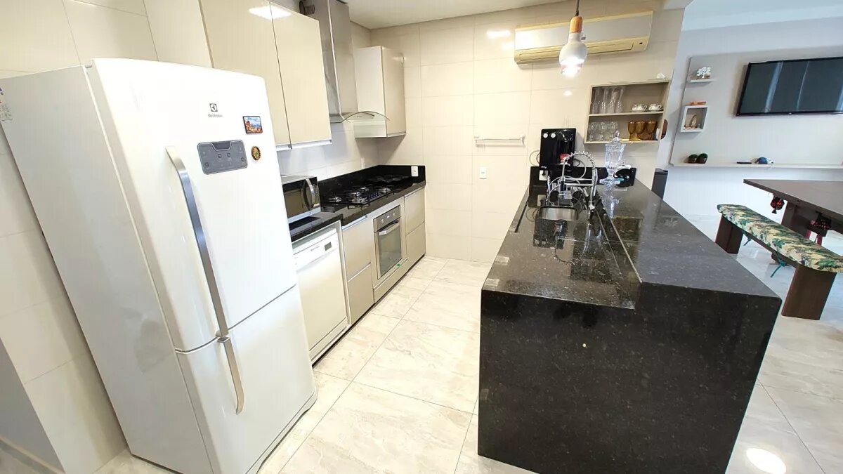 amigos. A cozinha – sistema americano - é um ambiente moderno, prático e funcional, os