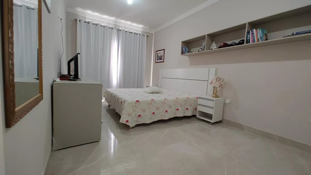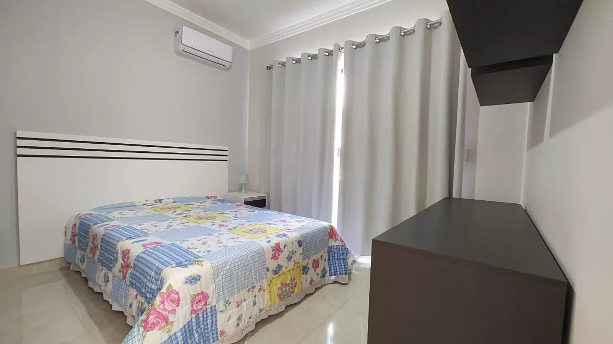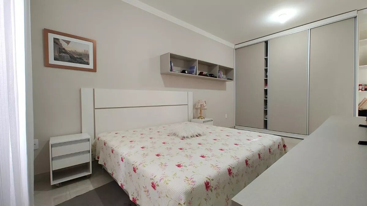 armários e cama de casal, sendo um dormitório com sacada frontal. A suíte principal