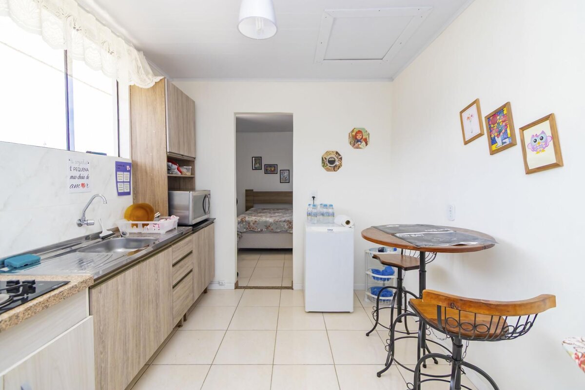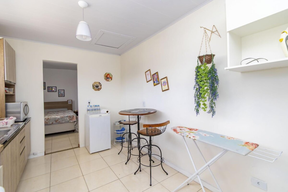 Piso superior contem: Apartamento todo mobiliado com aproximadamente 45m2, suíte com chuveiro 220v, lavanderia integrada com a cozinha.