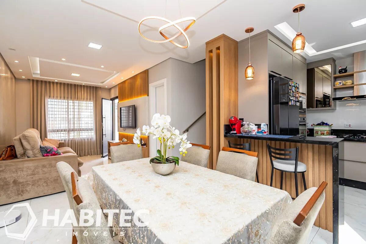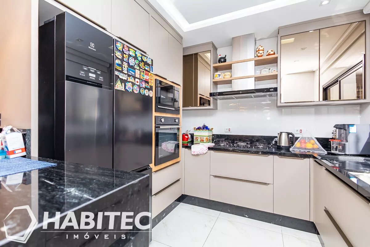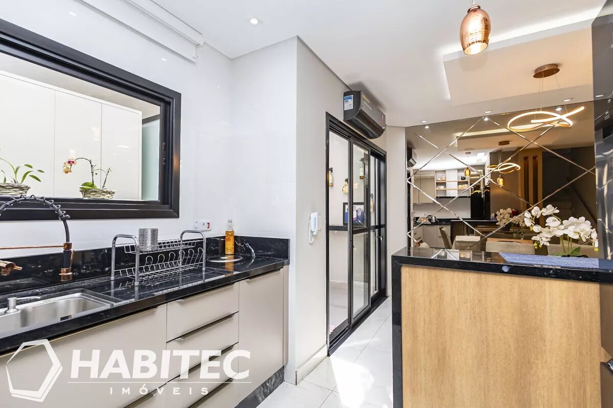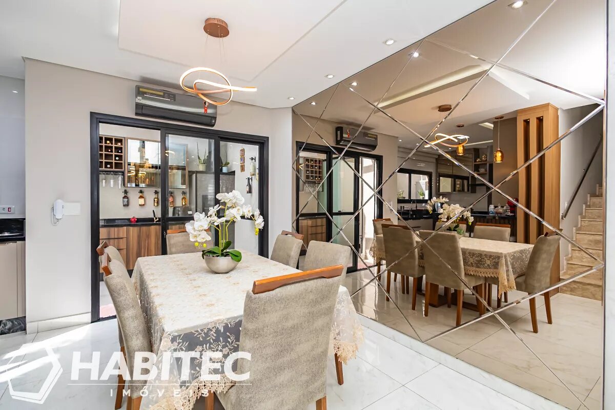 Sala de estar e jantar integradas, com ar-condicionado. Ainda no primeiro pavimento, um lavabo e cozinha modernizada com armários planejados e iluminação projetada. Aos fundos, uma churrasqueira com teto retrátil e área de serviço.