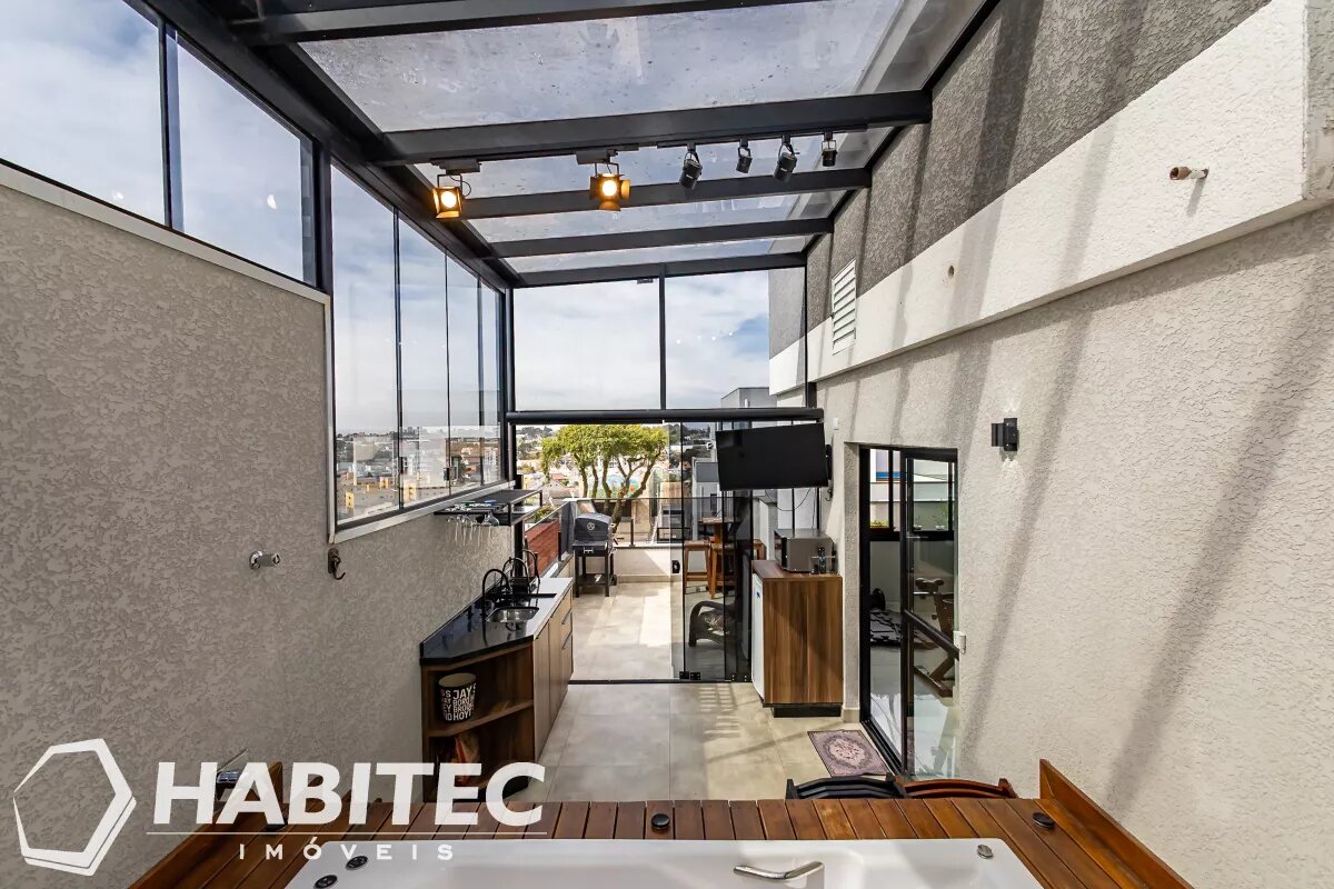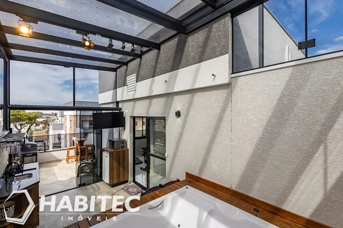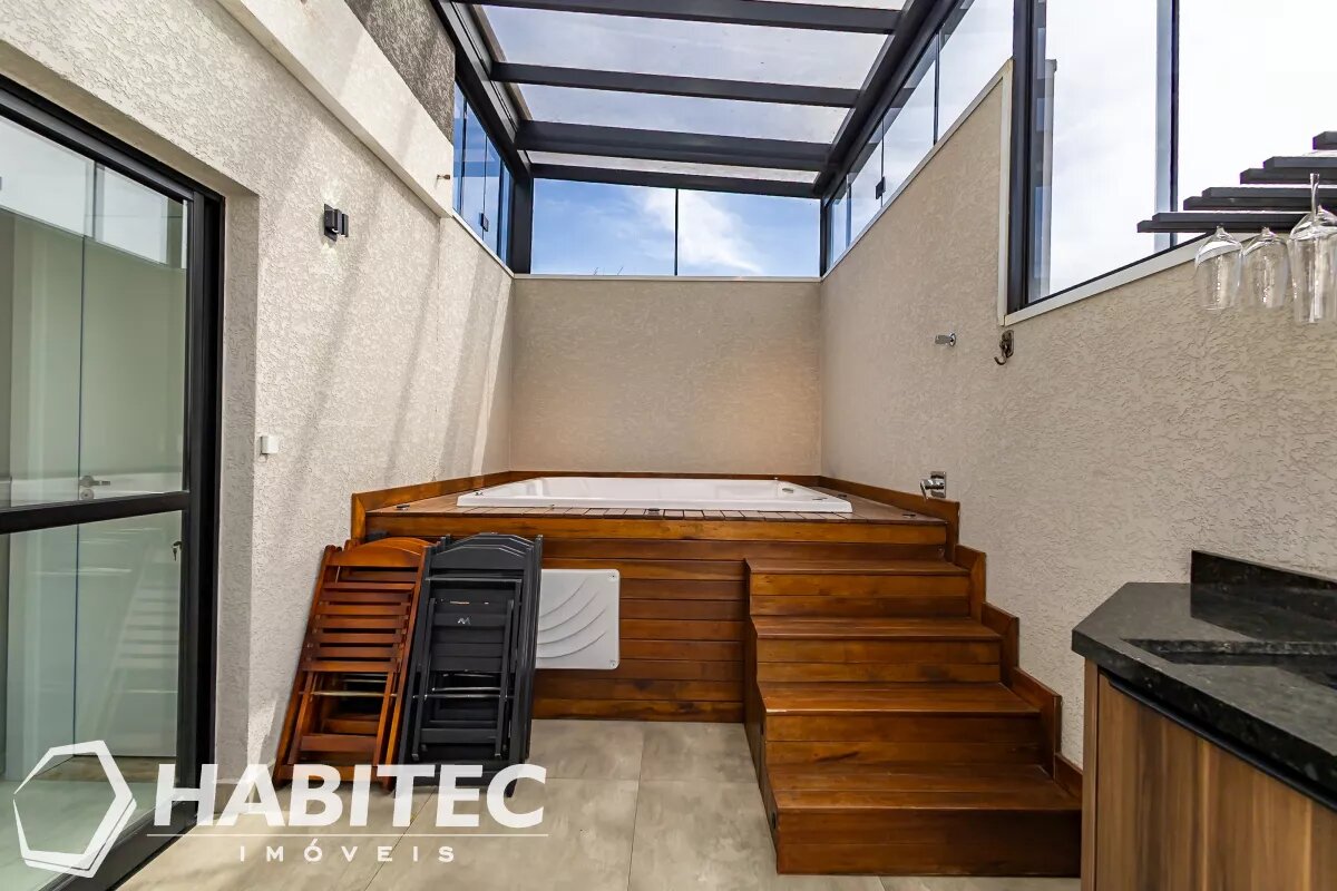 Ático com teto retrátil e uma jacuzzi privativa, o espaço externo tem uma vista livre perfeita pra finalizar o dia com relaxamento. Possui também mais uma sala que pode ser facilmente adaptada para mais um quarto ou um escritório para home-office.