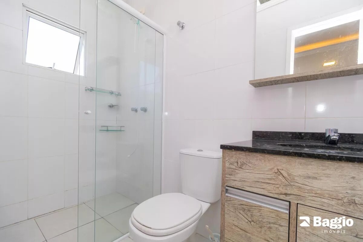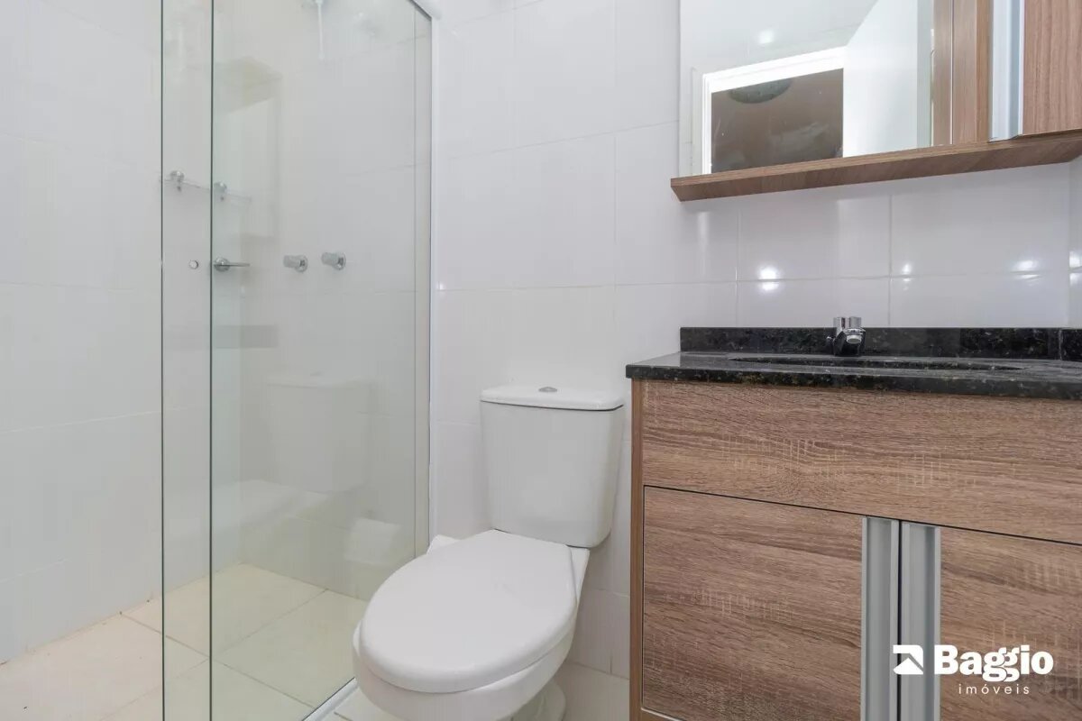 Banheiro social com armário, espelho e box em vidro temperado.