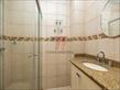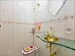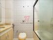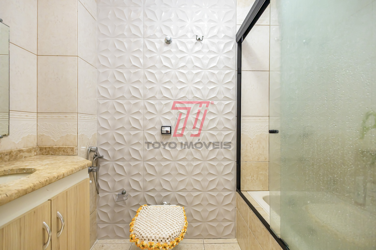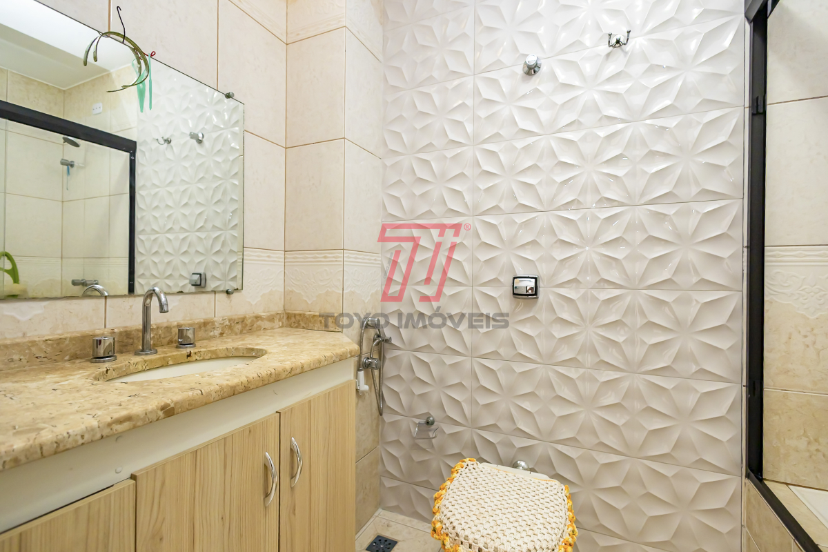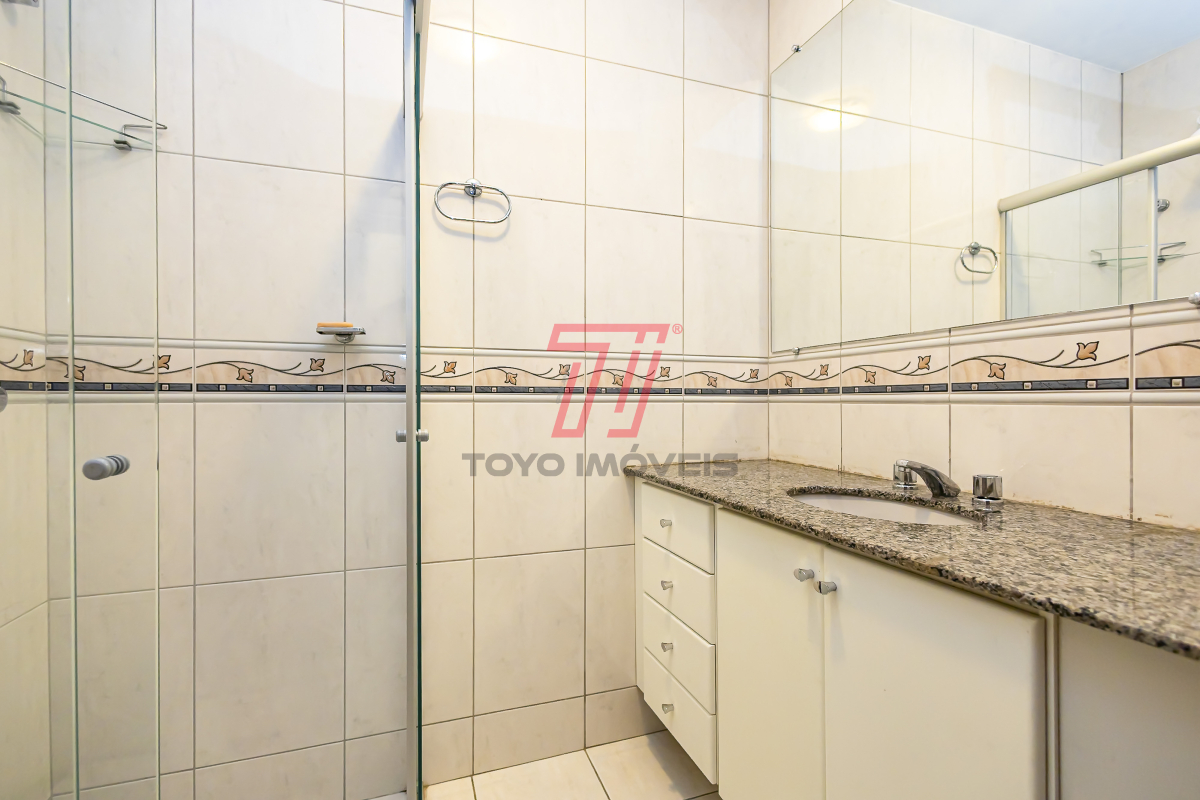 • Banheiro social completo, com armários, box de vidro e espelho.