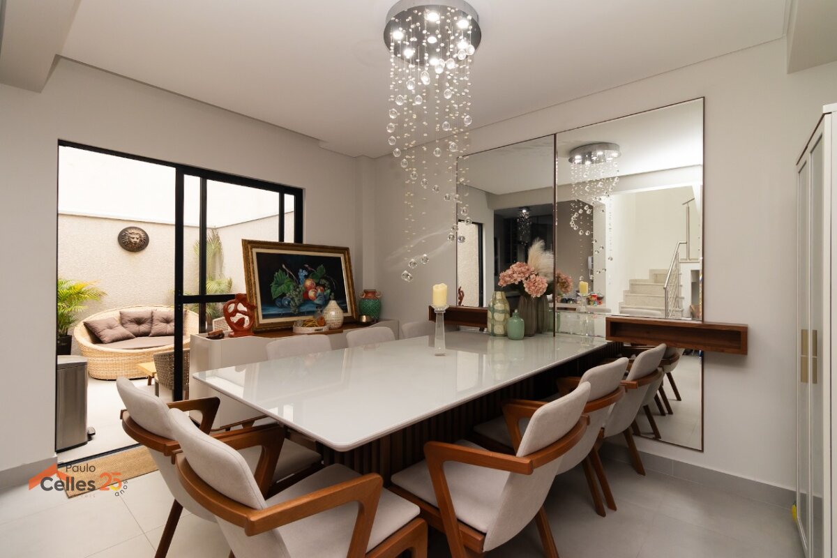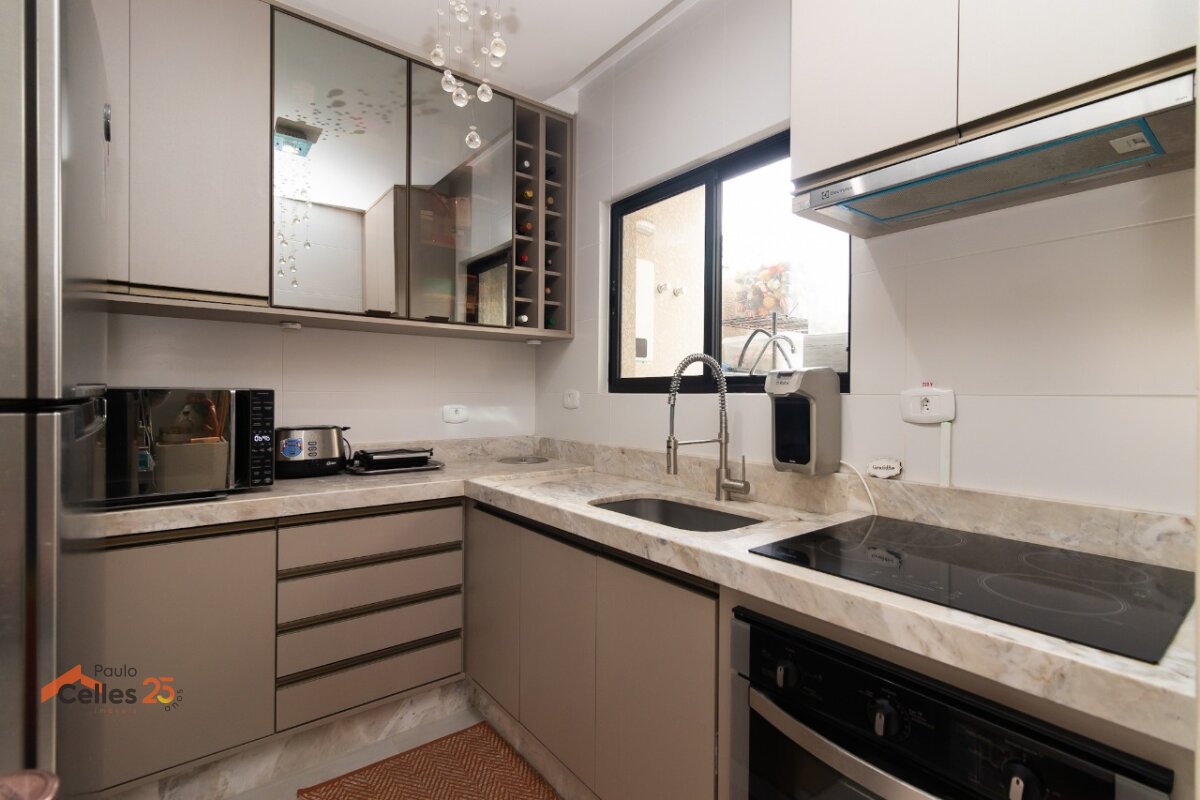 Logo na entrada, a sala de estar e jantar integradas, bem iluminada e acolhedora, cria o ambiente perfeito para momentos de convivência em família. A cozinha planejada se destaca pelo alto padrão de acabamento, equipada com armários de primeira linha, cooktop de indução, exaustor, forno elétrico, torneira gourmet, filtro de água e lixeira embutida, além de bancada em mármore branco Paraná, ideal para quem aprecia funcionalidade e design.