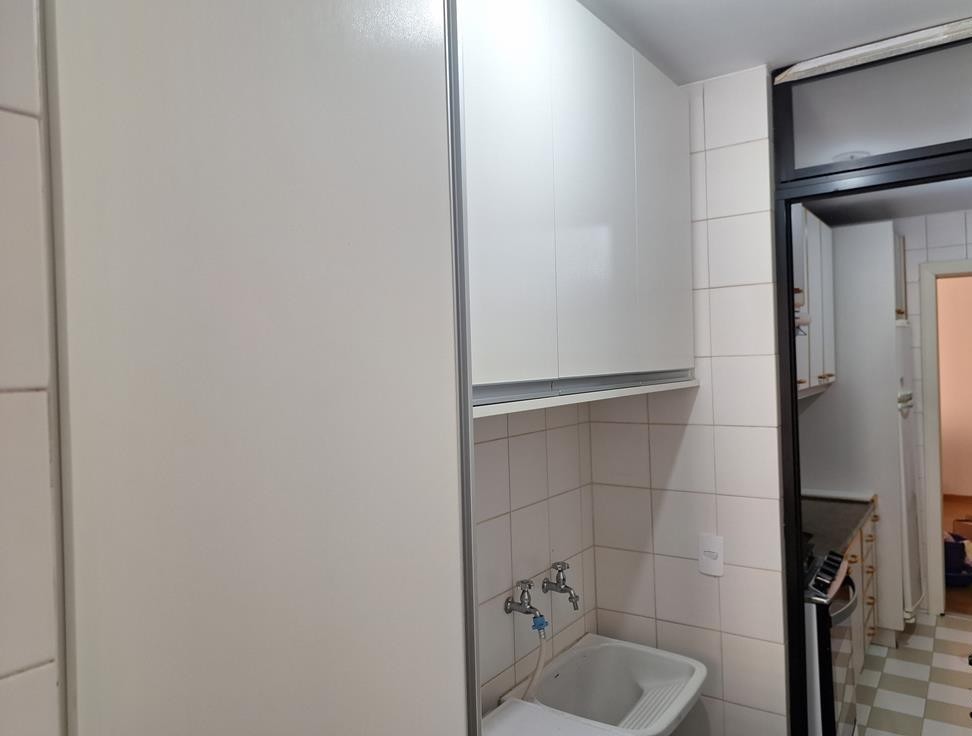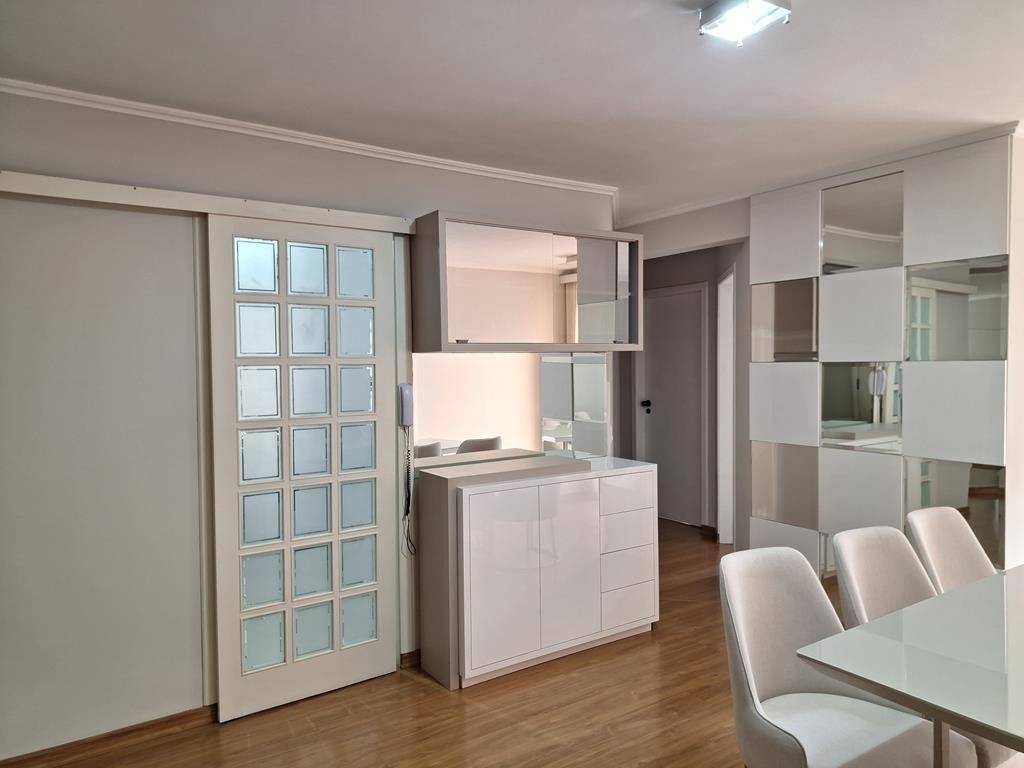 sala em dois ambientes com sacada e uma cozinha planejada com armários e tampo em granito.