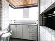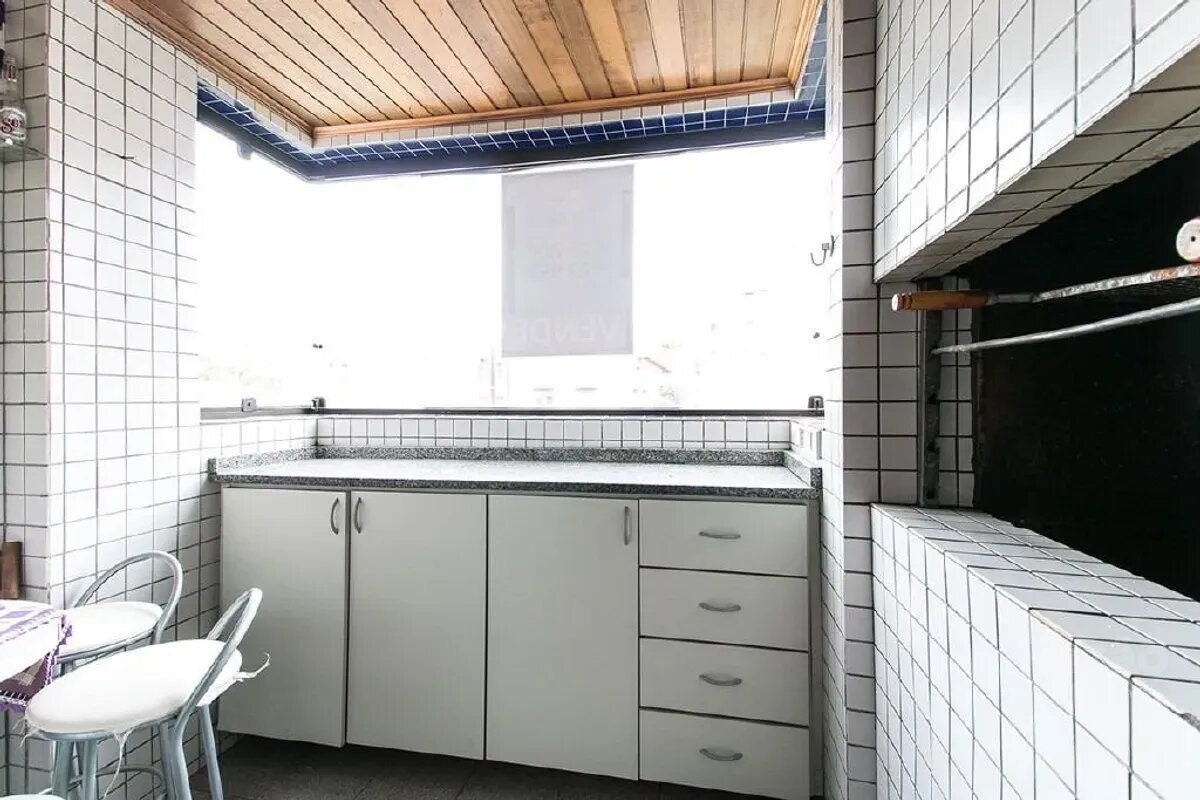 Sacada com churrasqueira e balcão fechada com vidro permitindo o uso gourmet em qualquer estação