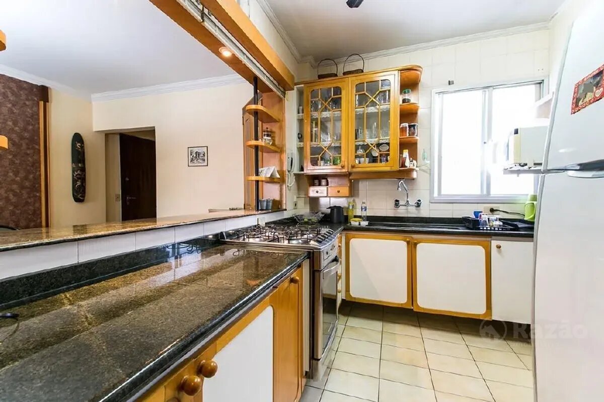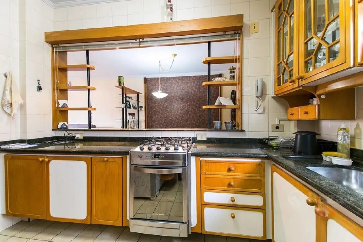 Cozinha estilo americana contendo armários, fogão e geladeira para máxima funcionalidade técnica