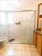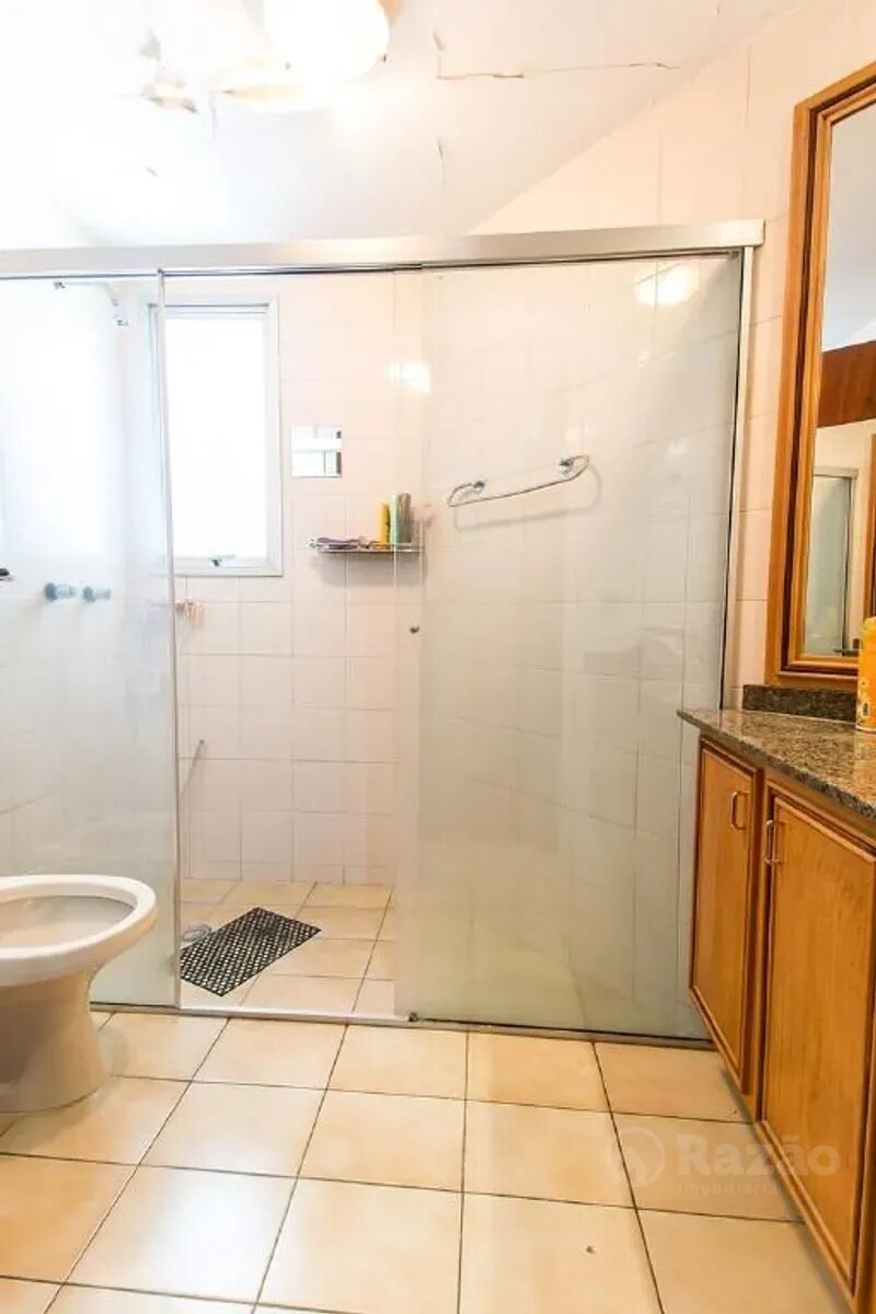 Banheiro social completo apresentando armários e box blindex garantindo praticidade e estilo