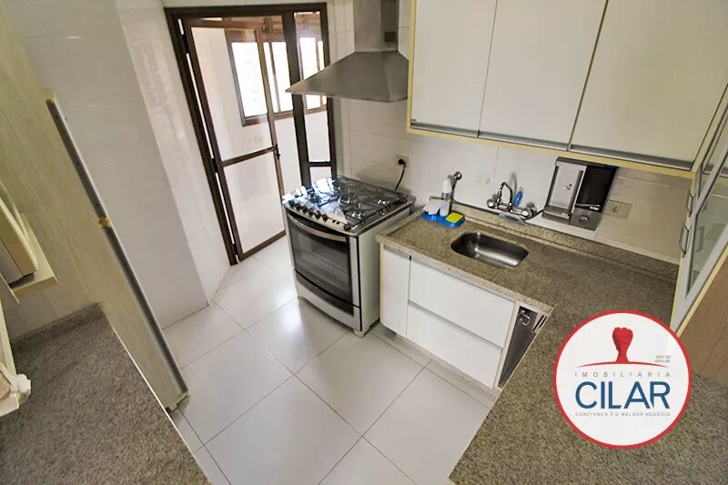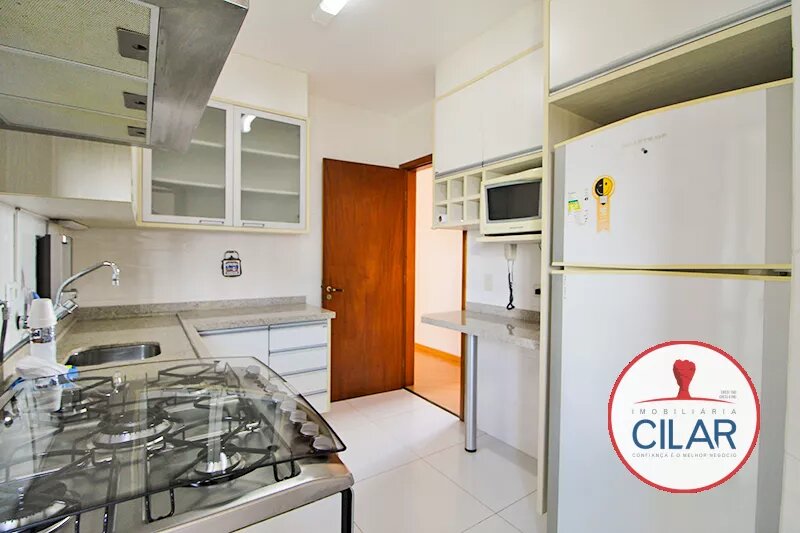 Cozinha toda mobiliada com armários, pia e bancada em granito, fogão, filtro de agua e coifa;