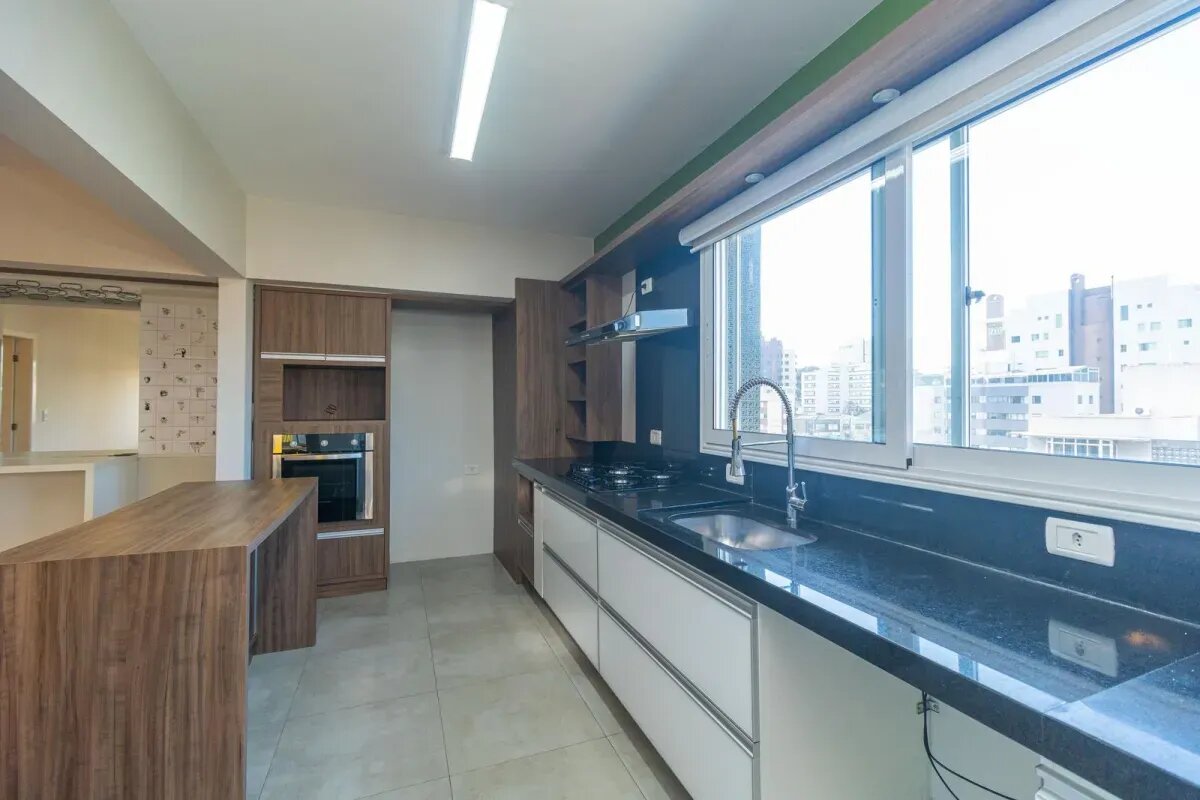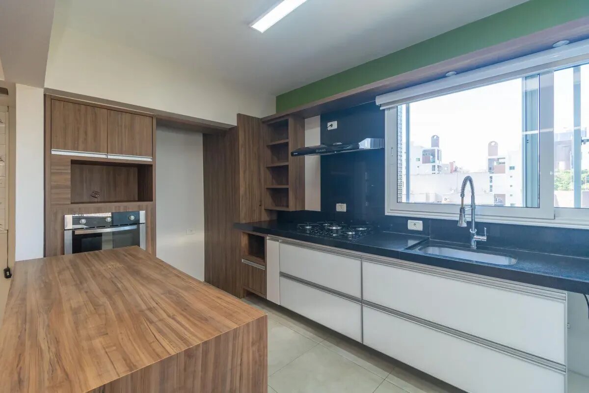 - Cozinha em conceito aberto com armários planejados, cooktop, depurador de ar e forno embutido,