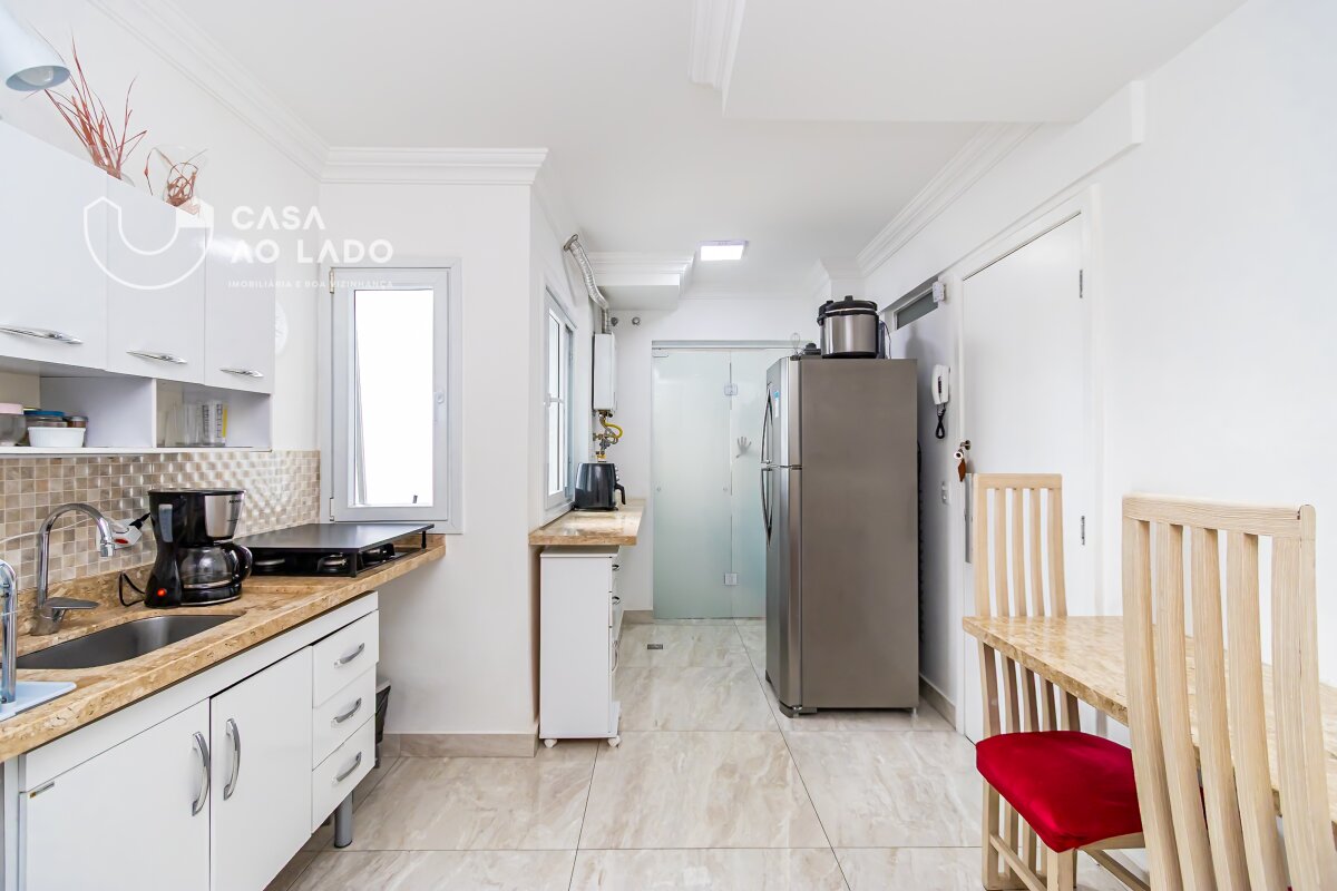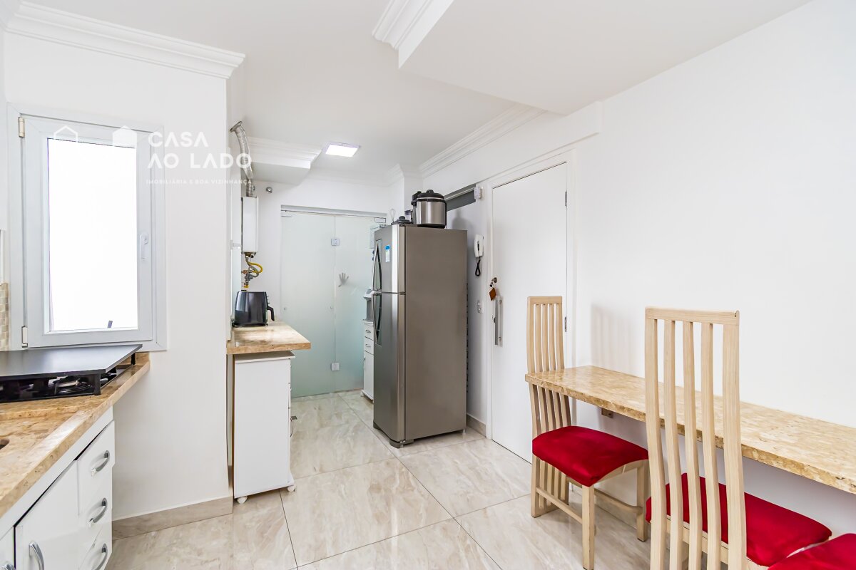Apartamento com 3 quartos, sendo 1 suíte, e 116 m² de área privativa, distribuídos de forma funcional e confortável. A planta conta com entrada de serviço, cozinha com armários embutidos, bancadas em granito, infraestrutura para aquecimento a gás, além de uma área de serviço com armários e porta de vidro que separa os ambientes. A sala é ampla, comportando dois ambientes — estar e jantar — e possui sacada com fechamento em vidro, proporcionando maior conforto e integração.