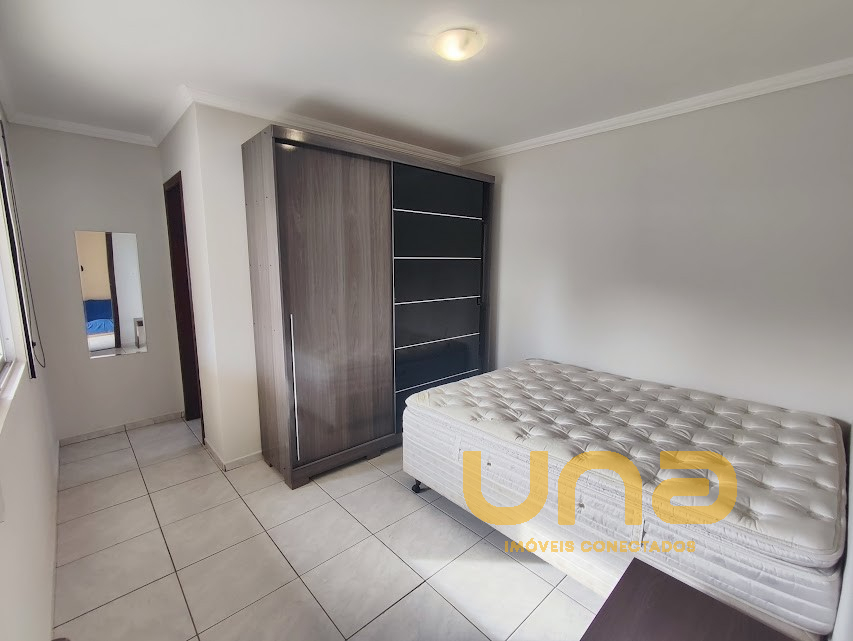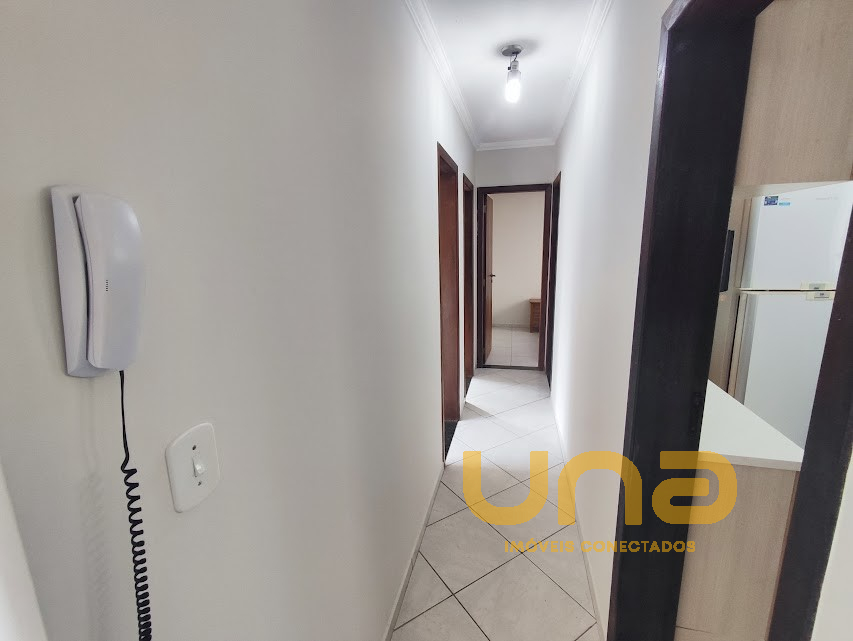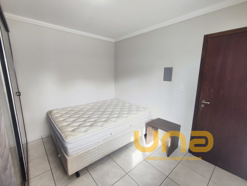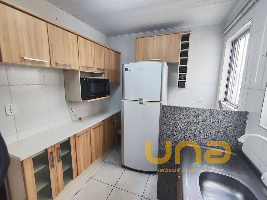- cozinha com armários, refrigerador duplex, fogão, microondas; sala: mesa com cadeiras,sofá e estante; 2 dormitórios com cama de casal, armário (estado regular)
