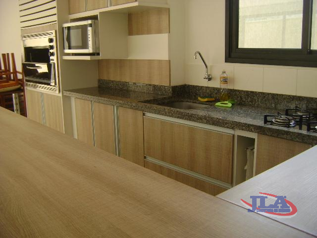 Cozinha completa, com armários, balcão de pia, fogão, geladeira e micro-ondas