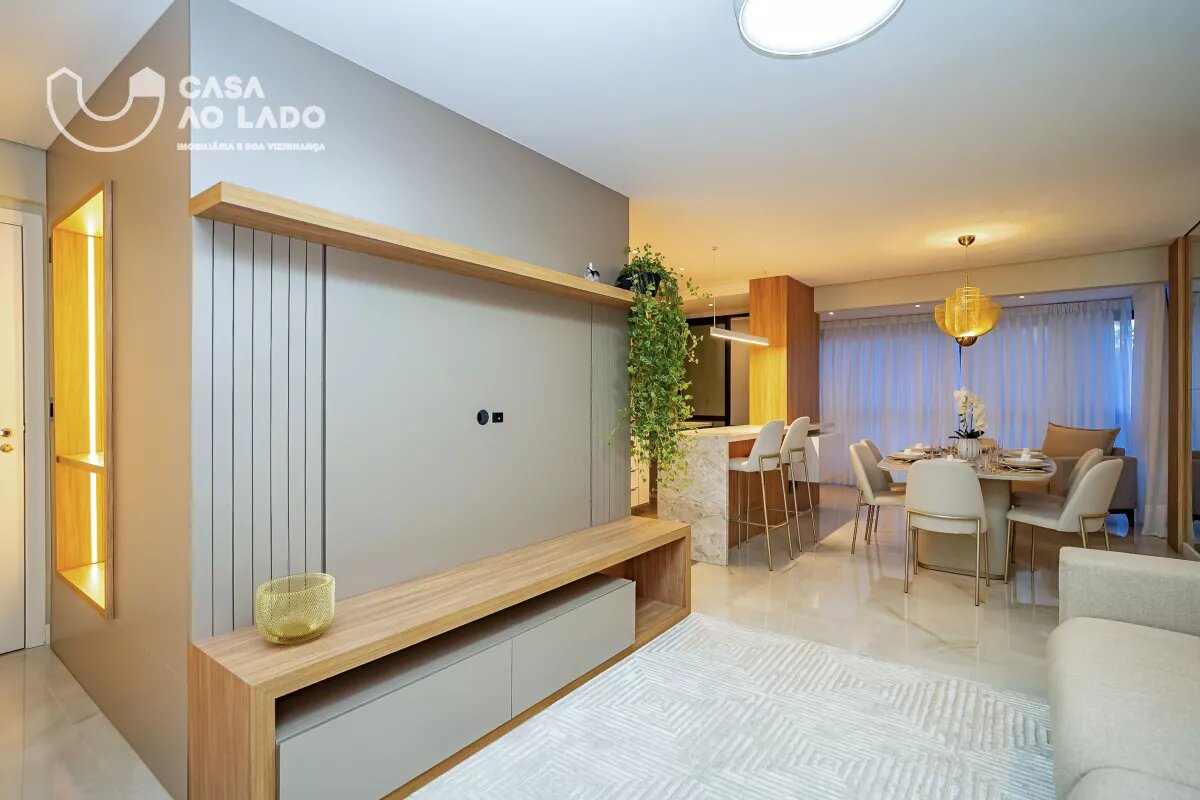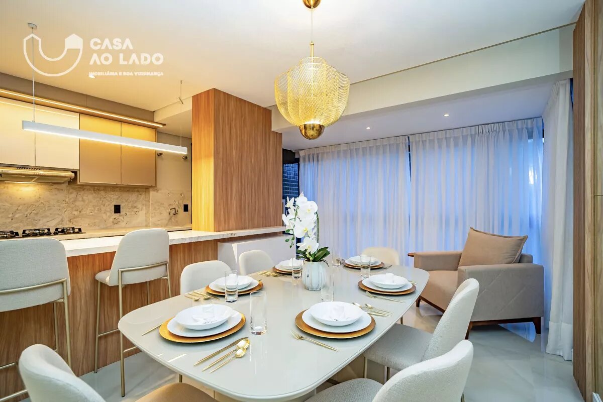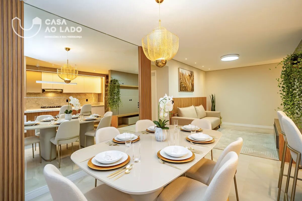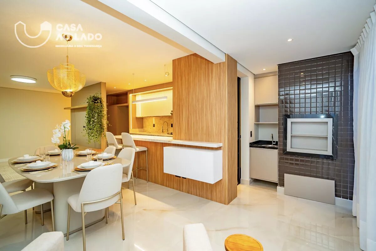 Ambientes Sociais e de Serviço: Sala de estar com sofá para 04 lugares, hack e painel para TV, sala de jantar integrada com mesa de 8 lugares, cozinha com armários planejados, sacada fechada em vidro com piso nivelado e churrasqueira á carvão.