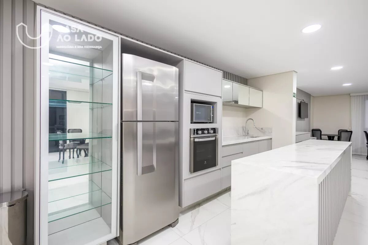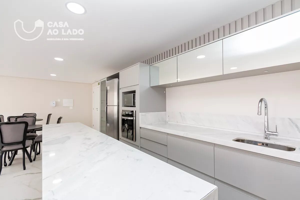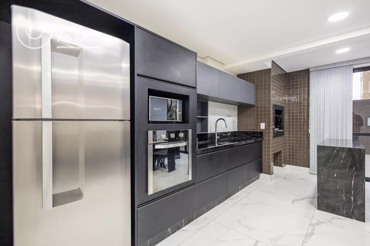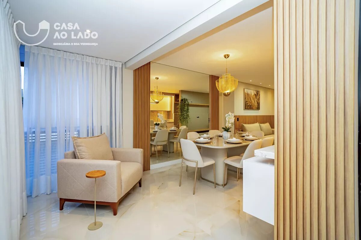 Ambientes Sociais e de Serviço: Sala de estar com sofá para 04 lugares, hack e painel para TV, sala de jantar integrada com mesa de 8 lugares, cozinha com armários planejados, sacada fechada em vidro com piso nivelado e churrasqueira á carvão.